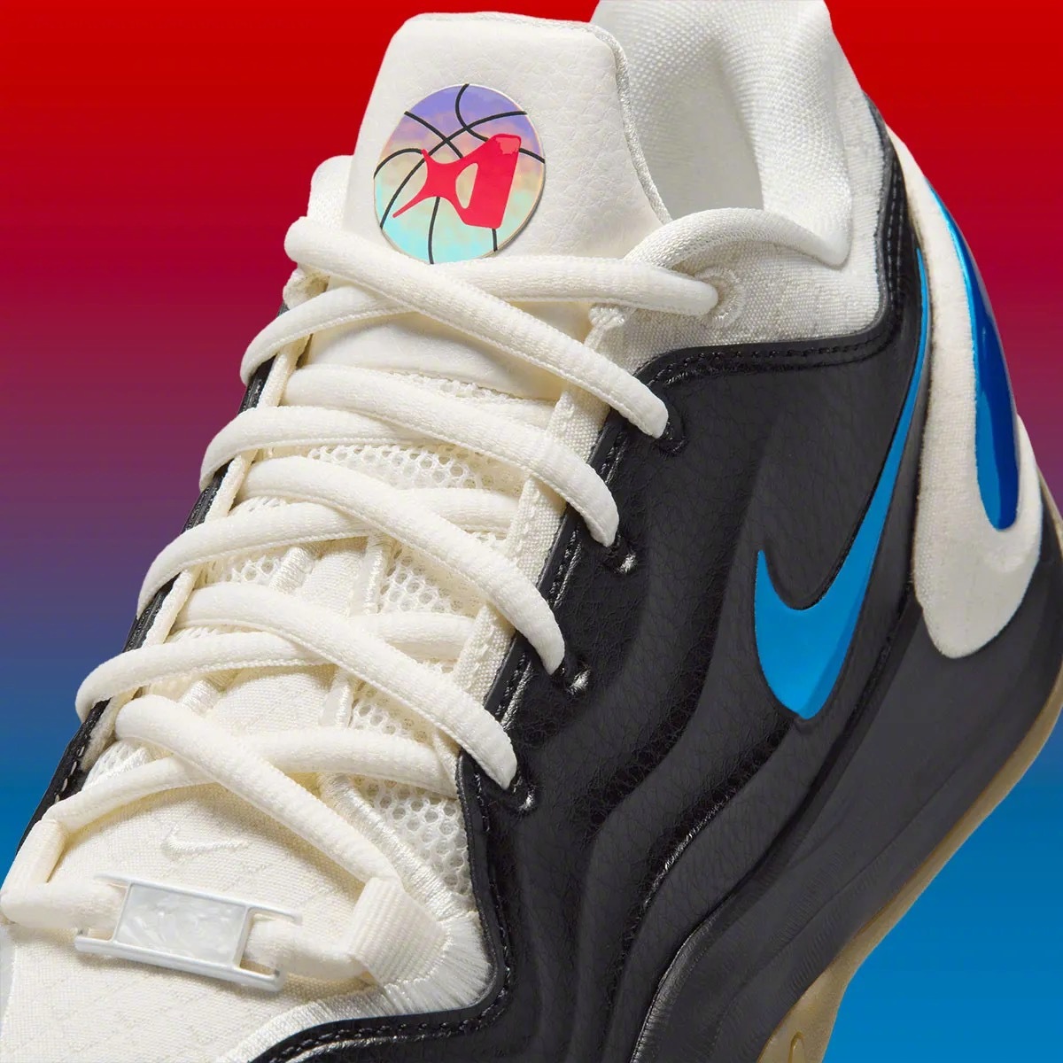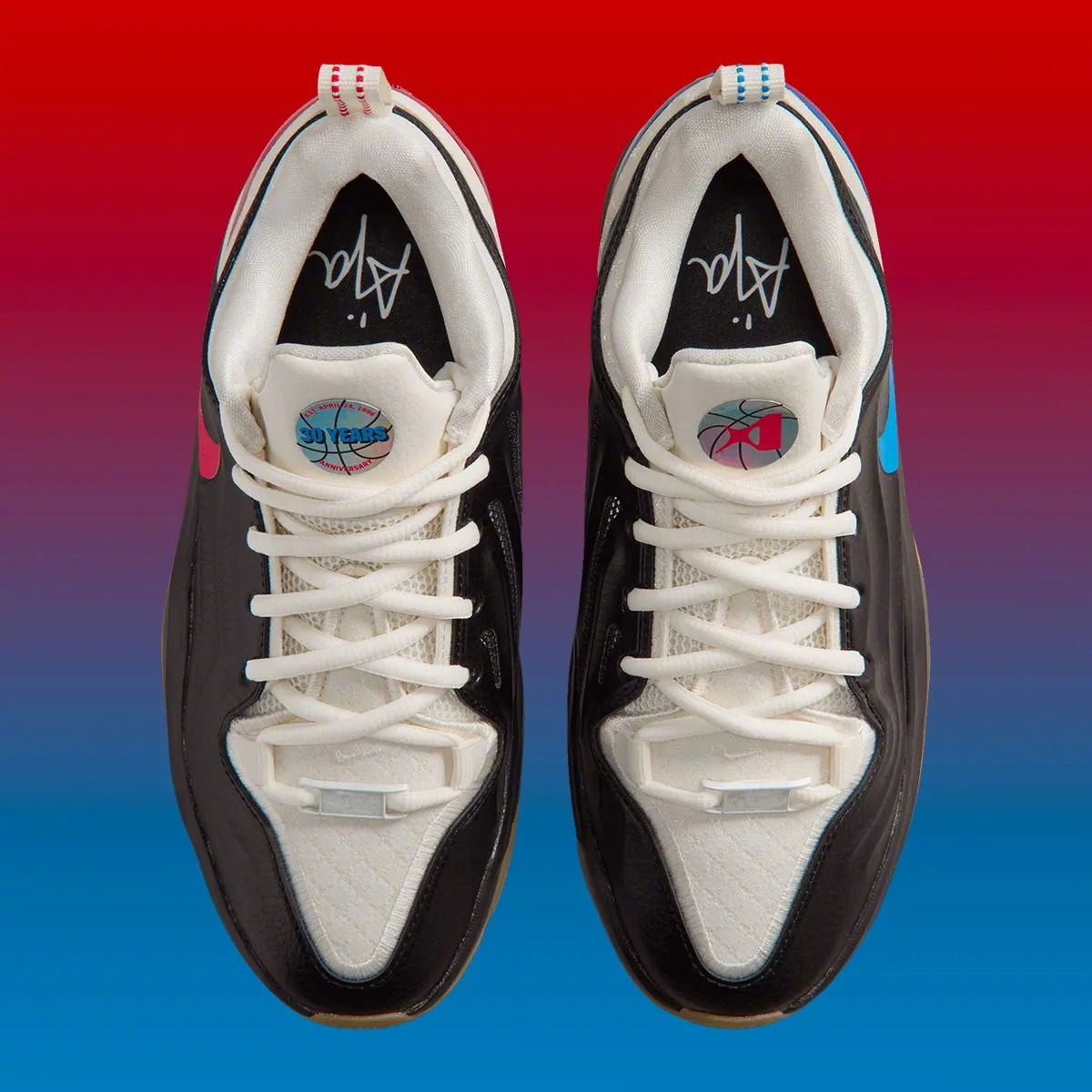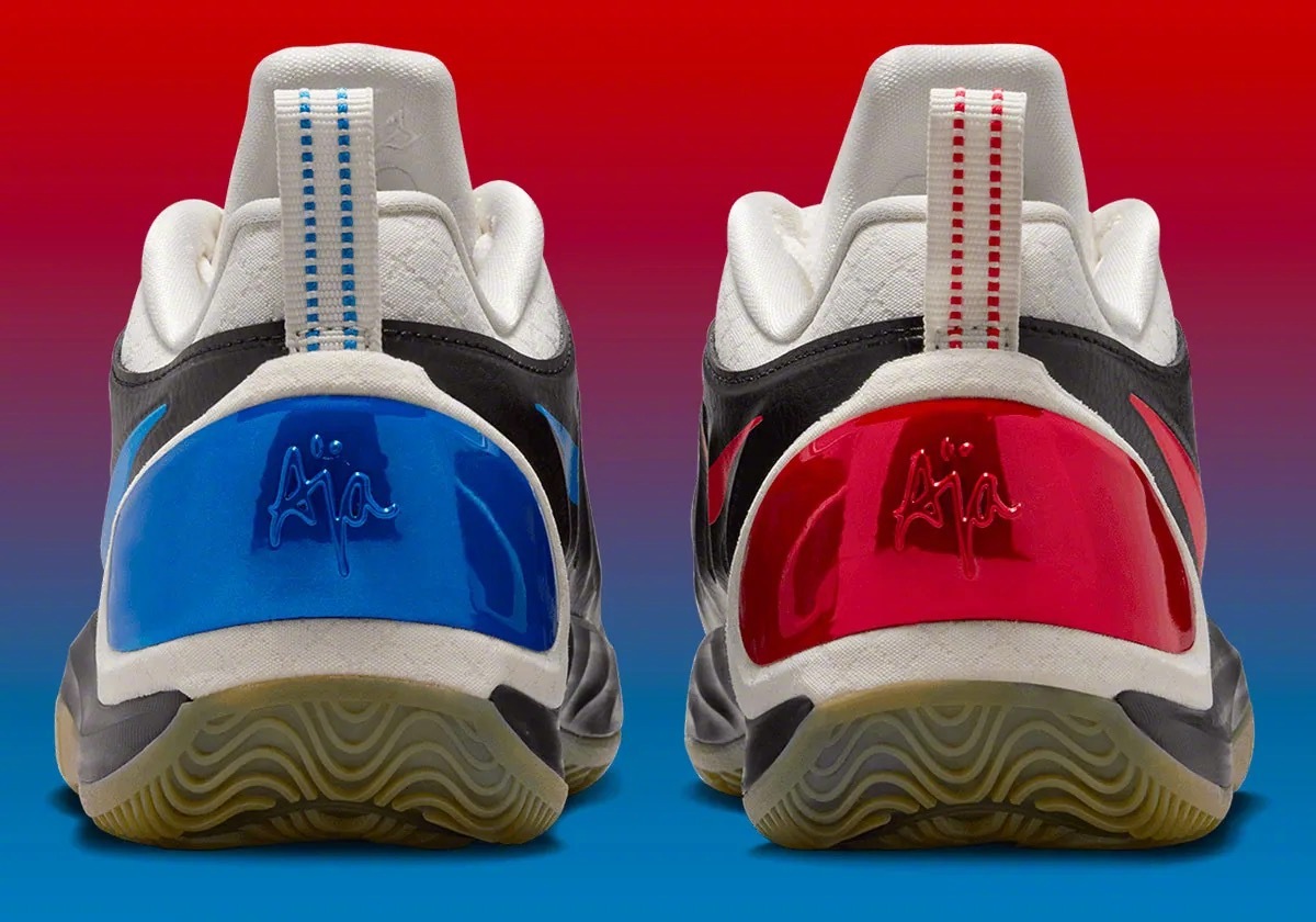阿贾·威尔逊 A’TWO「WNBA 30周年」纪念版官图,黑色皮革鞋面+白色内衬和鞋舌,左右脚分别为红&蓝鸳鸯色设计,右脚鞋舌上带有WNBA 30周年的纪念标识🏀