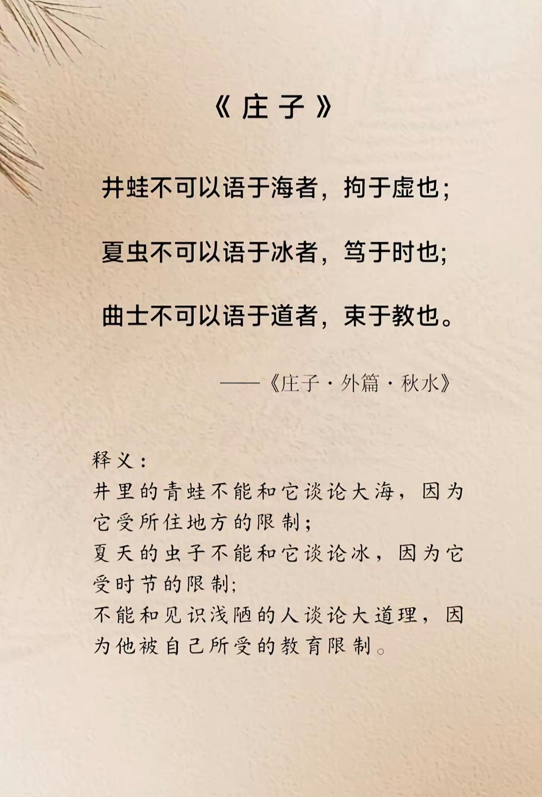 人生四大局限: 夏虫不可语冰(时间局限) 青蛙不可与海(空间局限) 盲人不可与光