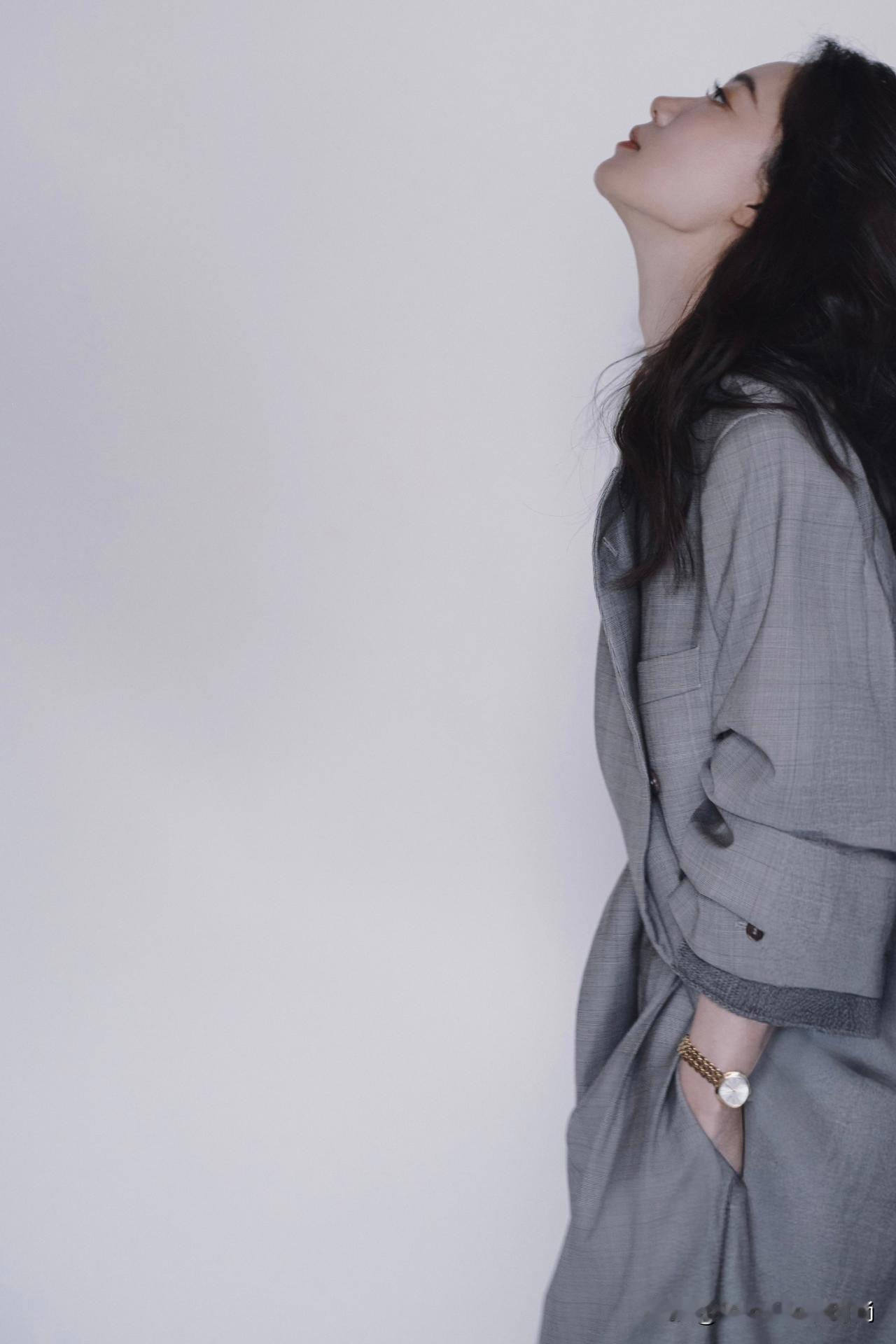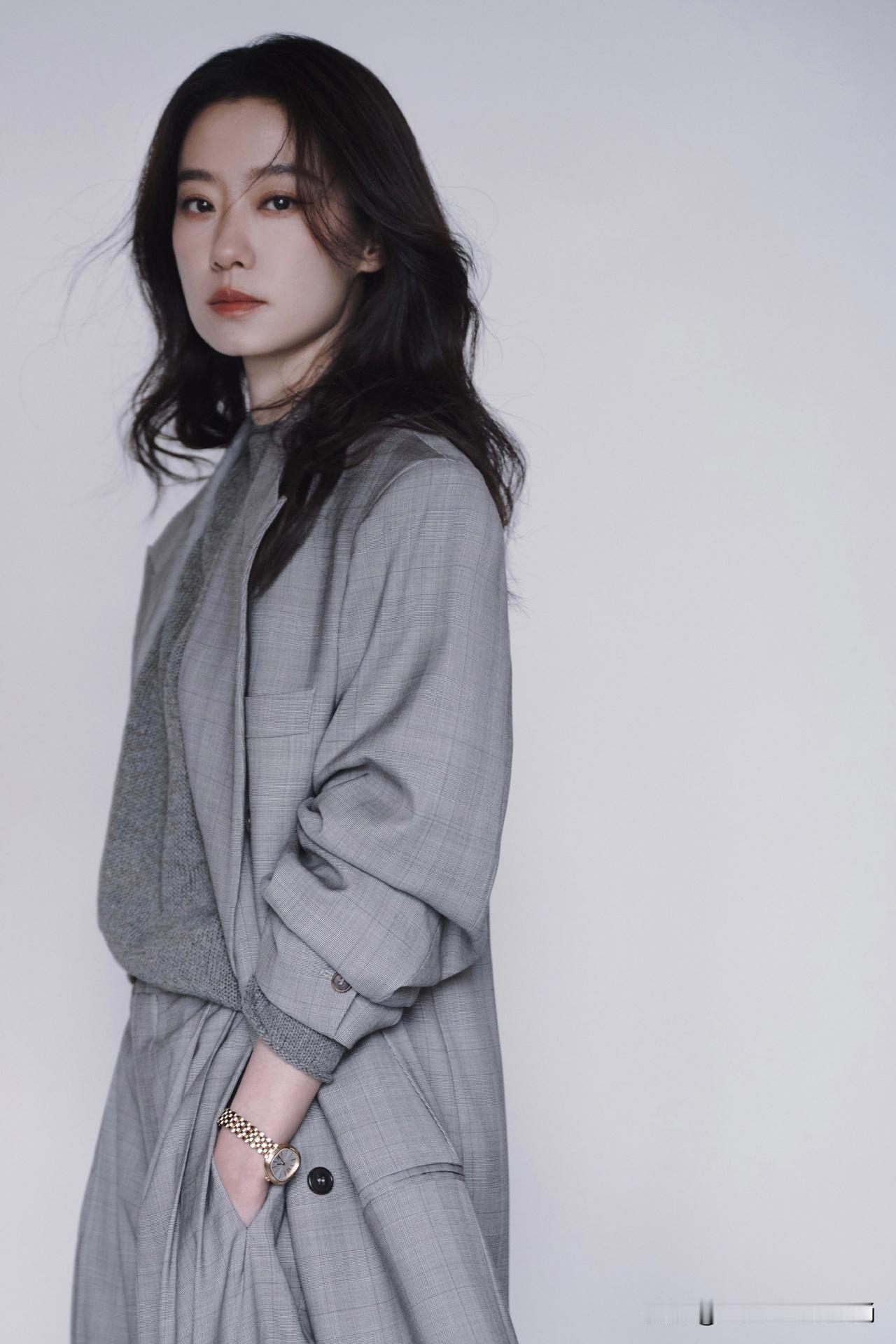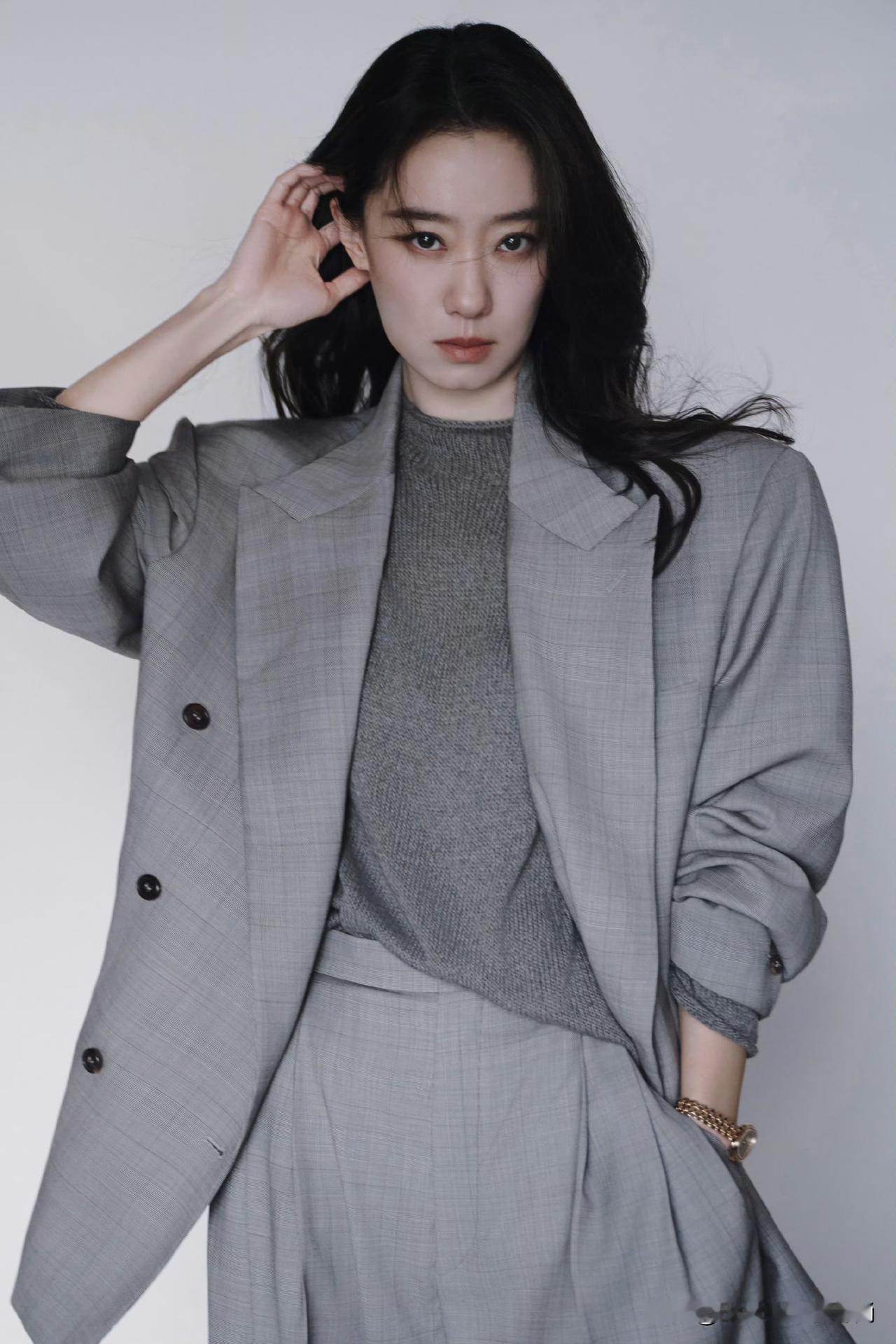 挽起的袖口增添随性,慵懒卷发中和西装的硬朗,金色手表作为唯一配饰点睛。整体将知性温柔与飒爽干练完美融合,清冷气质适配度满分,是教科书级别的通勤穿搭范本。
