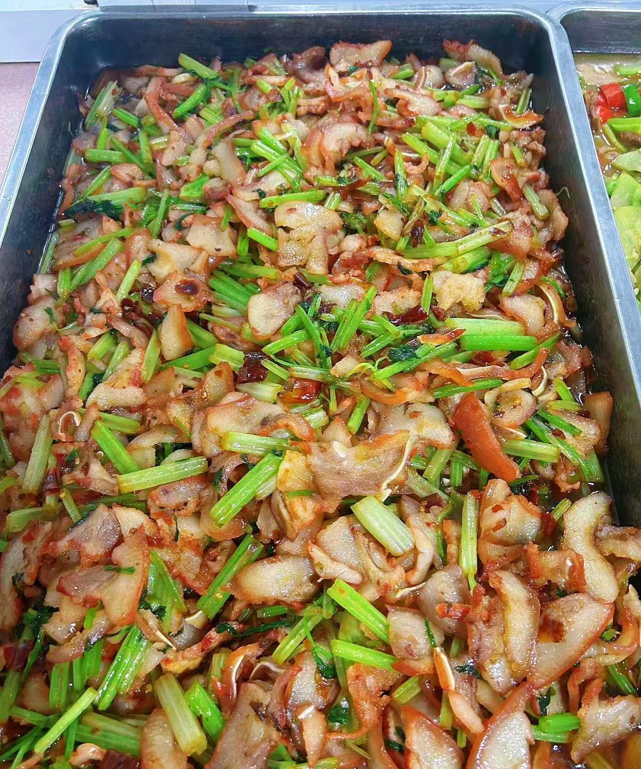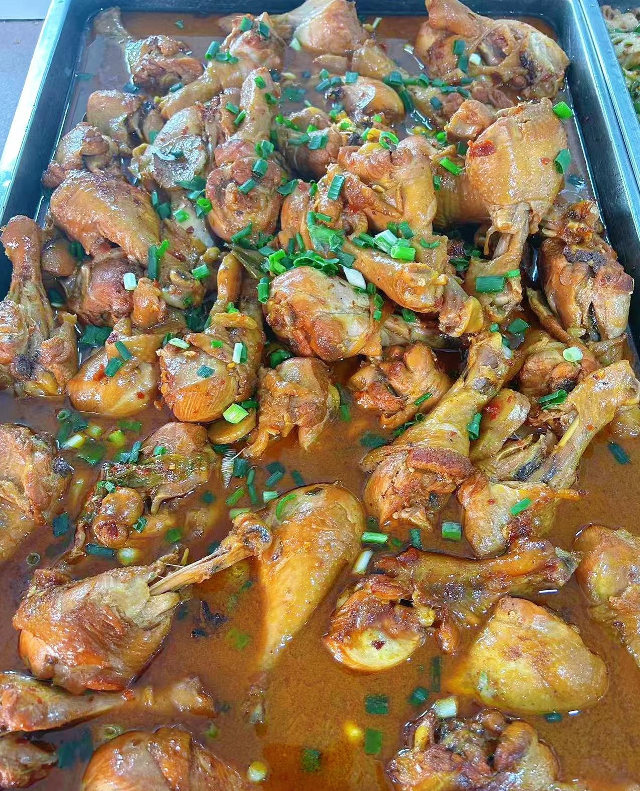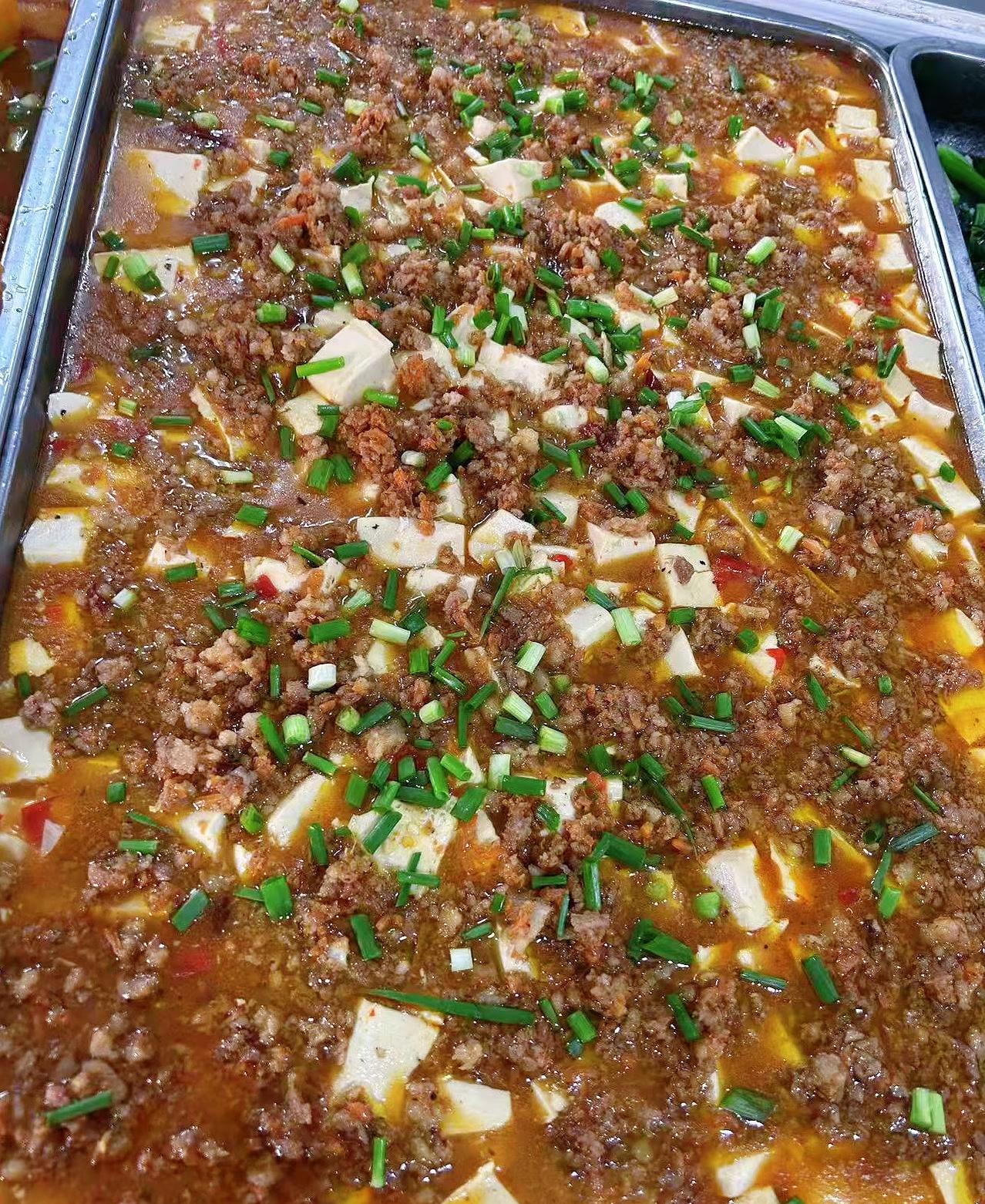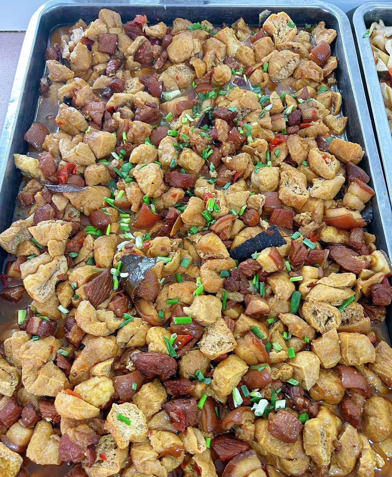 这是新来的师傅给工地食堂炒的大锅菜。梅干菜烧肉、土豆烧肉、油豆腐烧肉,香茹炖鸡、香干炒肉片、芹菜炒顺风、卤鸡腿、黄豆烧猪脚、麻婆豆腐、豆角炒肉、炒白菜、酸辣包菜,荤素搭配,大众口味还是很适合大家味的。