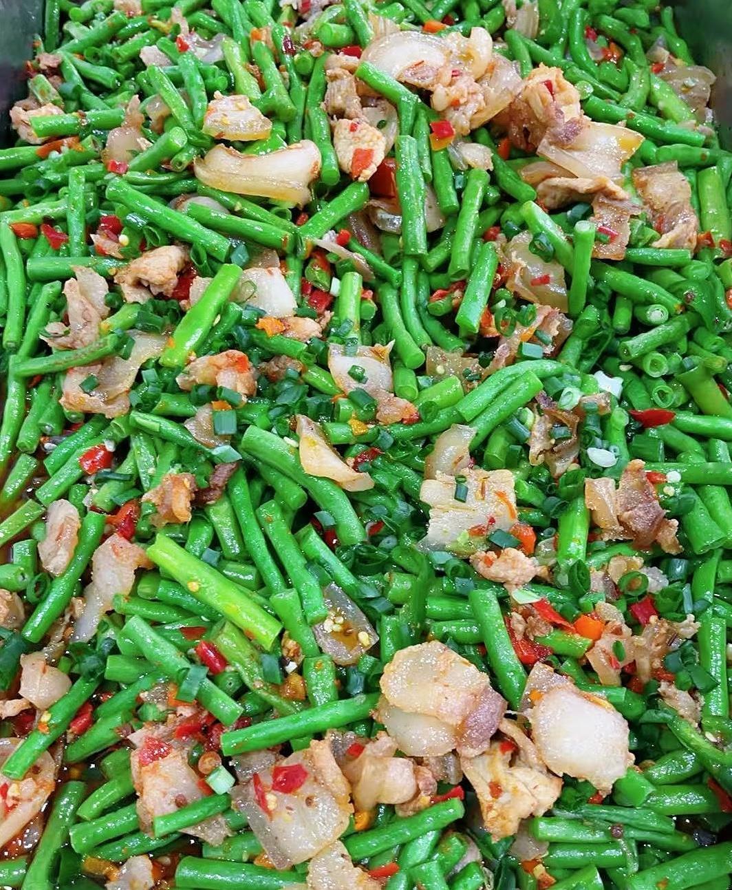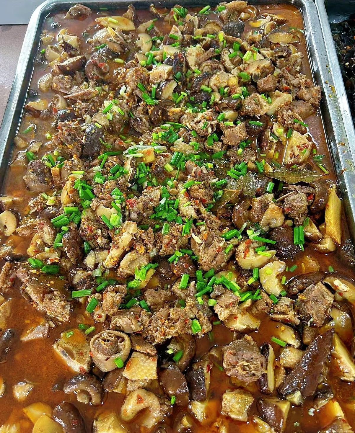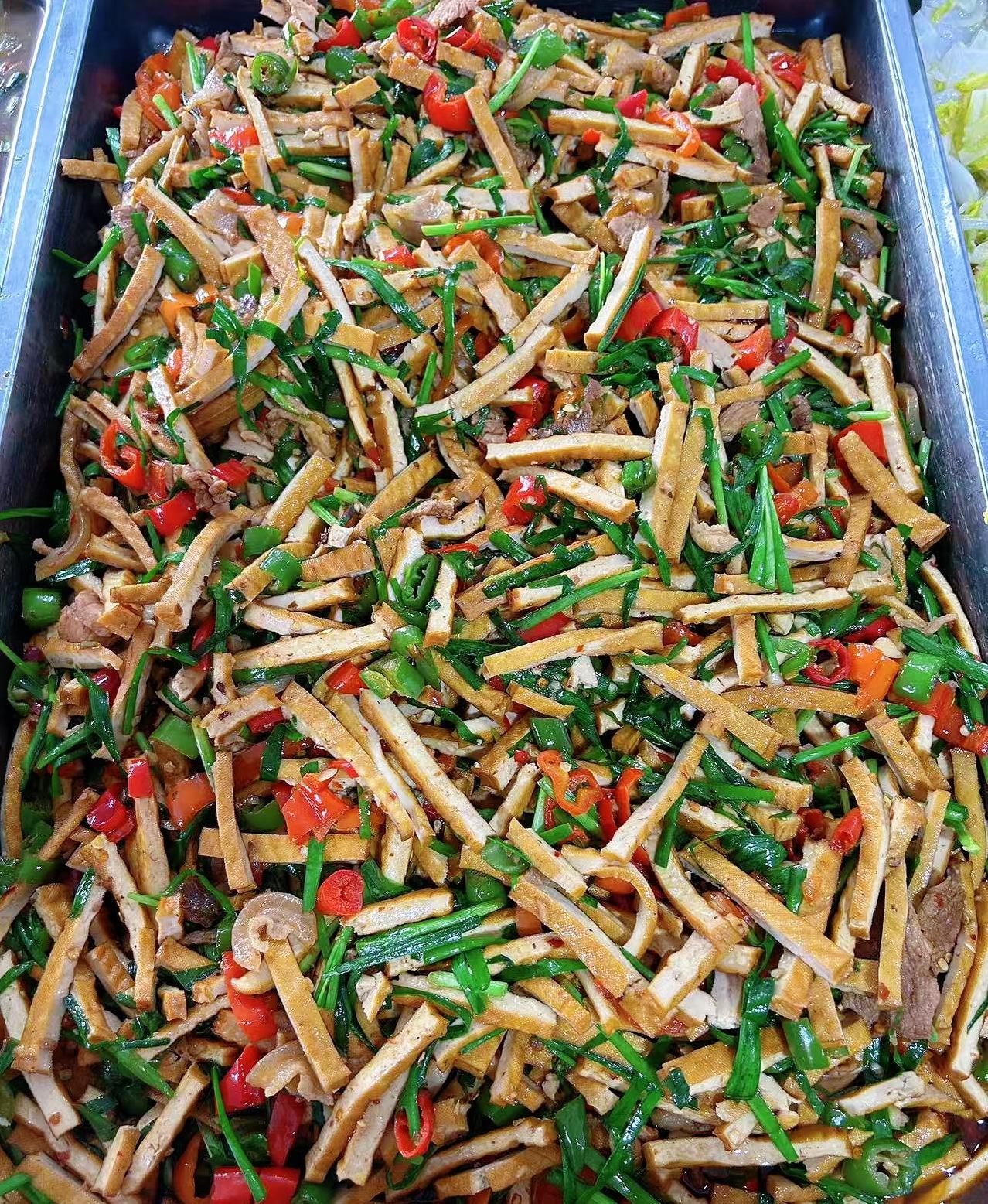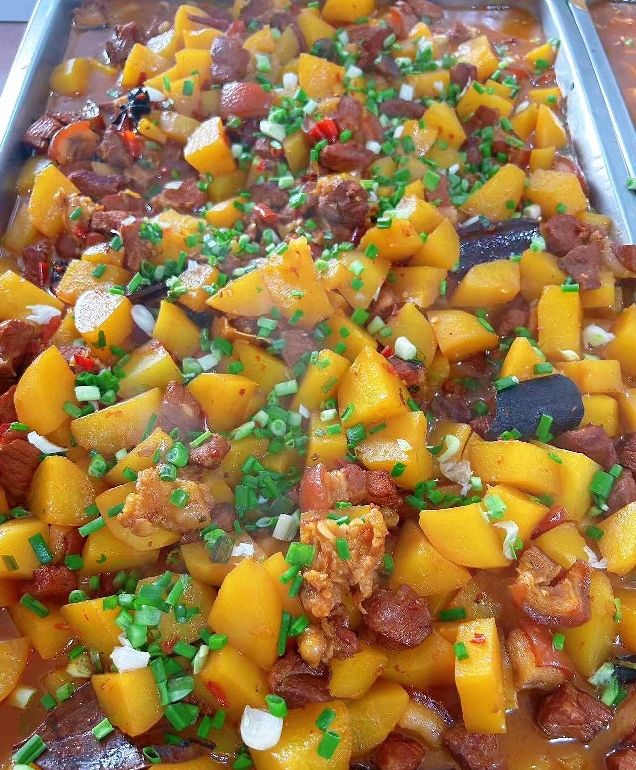 这是新来的师傅给工地食堂炒的大锅菜。梅干菜烧肉、土豆烧肉、油豆腐烧肉,香茹炖鸡、香干炒肉片、芹菜炒顺风、卤鸡腿、黄豆烧猪脚、麻婆豆腐、豆角炒肉、炒白菜、酸辣包菜,荤素搭配,大众口味还是很适合大家味的。