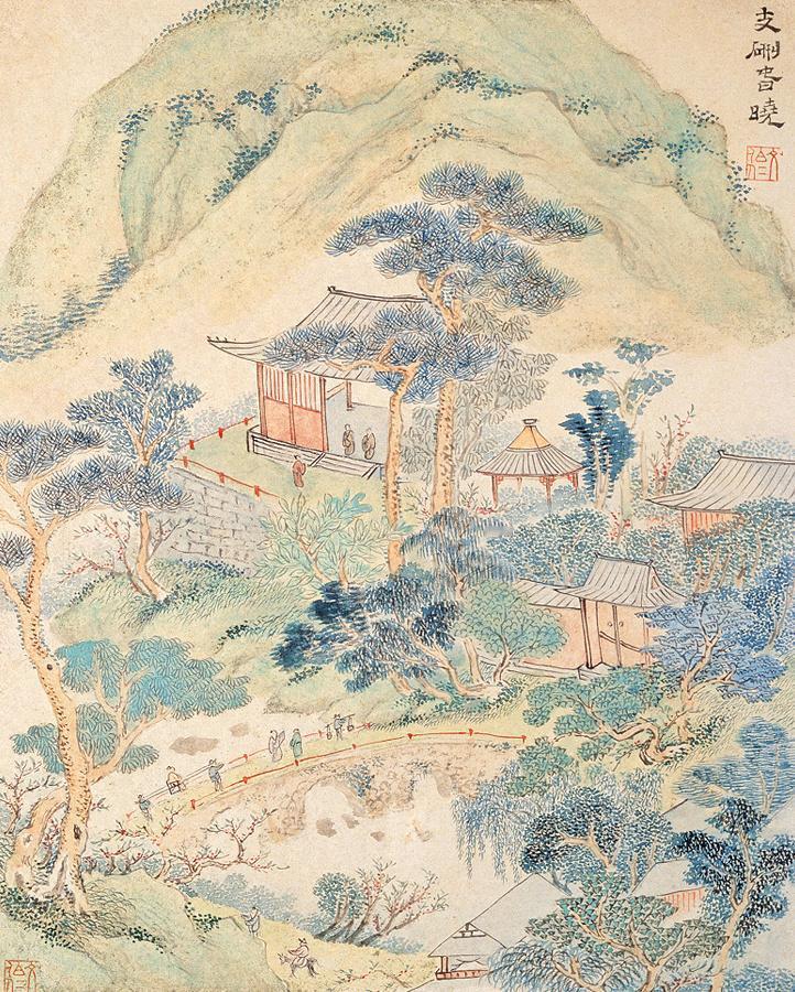 绘支硎山春日晨景,山寺隐于山林,晨雾轻笼,草木葱翠,游人漫步山间,一派清新明媚的江南春晓。