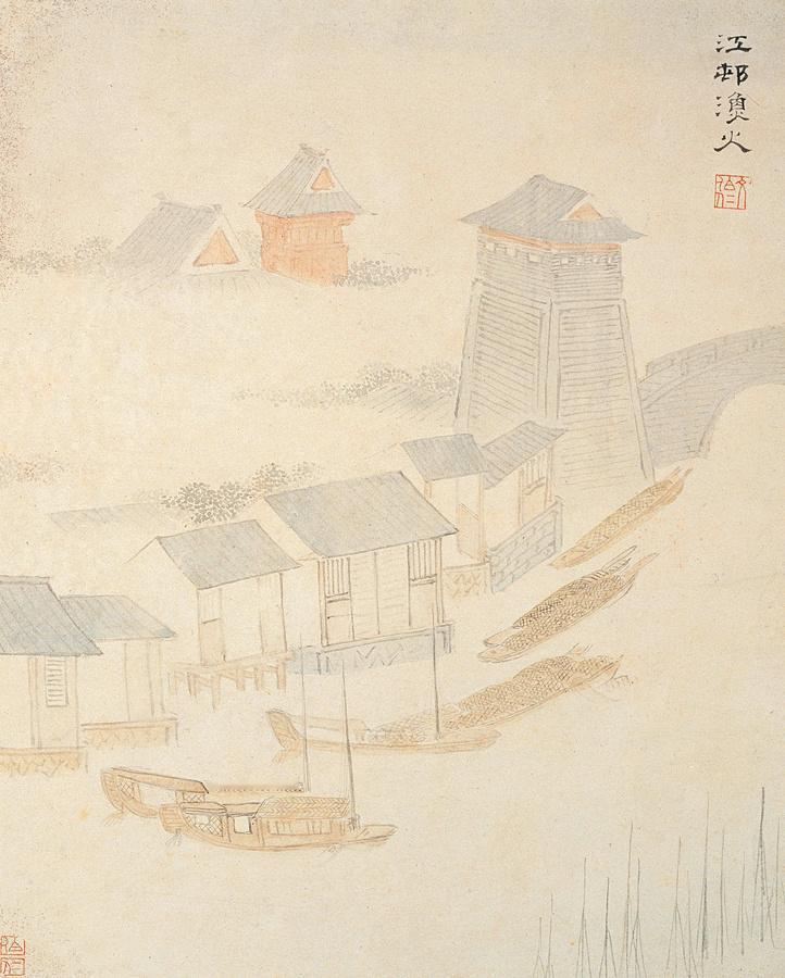 摹枫桥江村夜色,渔舟泊岸,灯火点点,江村静谧,小桥流水相映,寒寂中透着温婉的水乡烟火气。