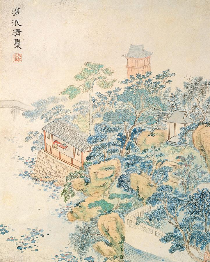 写沧浪亭夏日园林,茂林修竹掩映亭台,池水清幽,文士闲坐其间,暑气尽消,笔墨间透出清凉闲适的文人意趣。