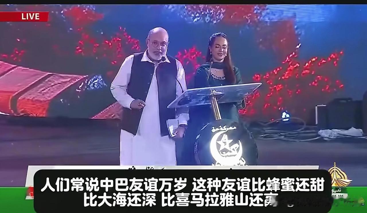 庆典主持人说:中巴友谊比蜂蜜还甜,比大海还深,比喜马拉雅山还高。现在为您带来激昂的中国爱国歌曲《大中国》,这首歌赞颂了中国坚韧不拔的精神,象征着中巴之间牢不可破的友谊。