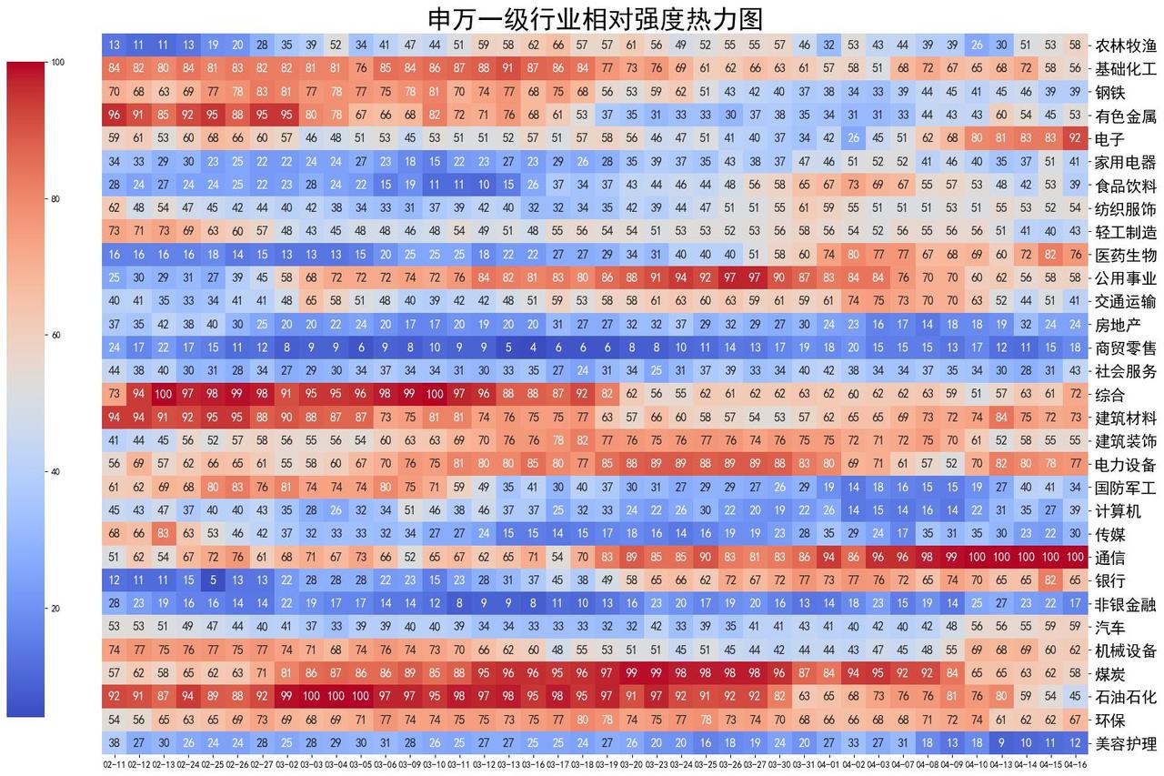 每个小格子代表某个行业在当天的强度,数值介于0-100之间,强度大于50者说明强于市场基准,值得花更多精力。