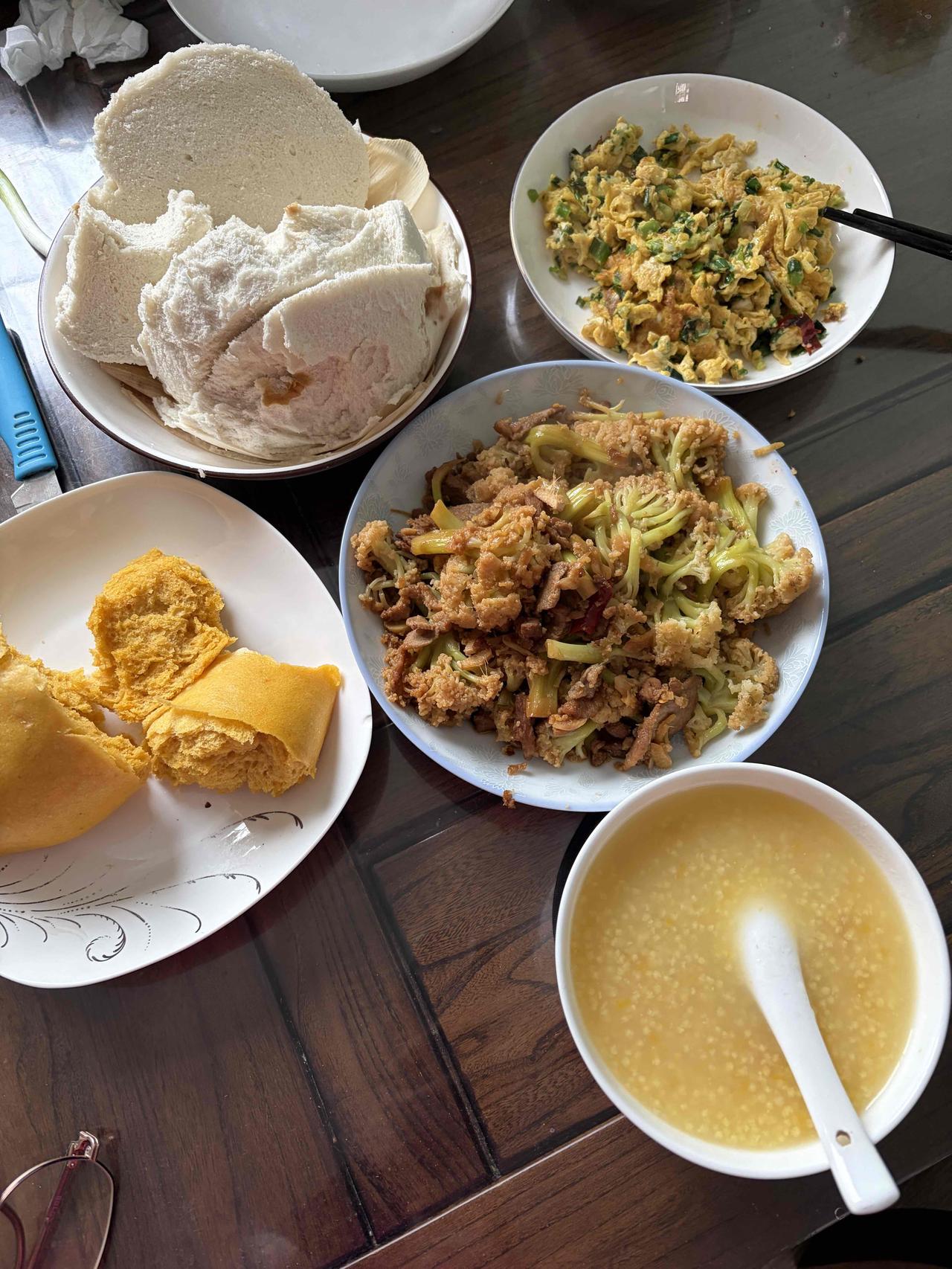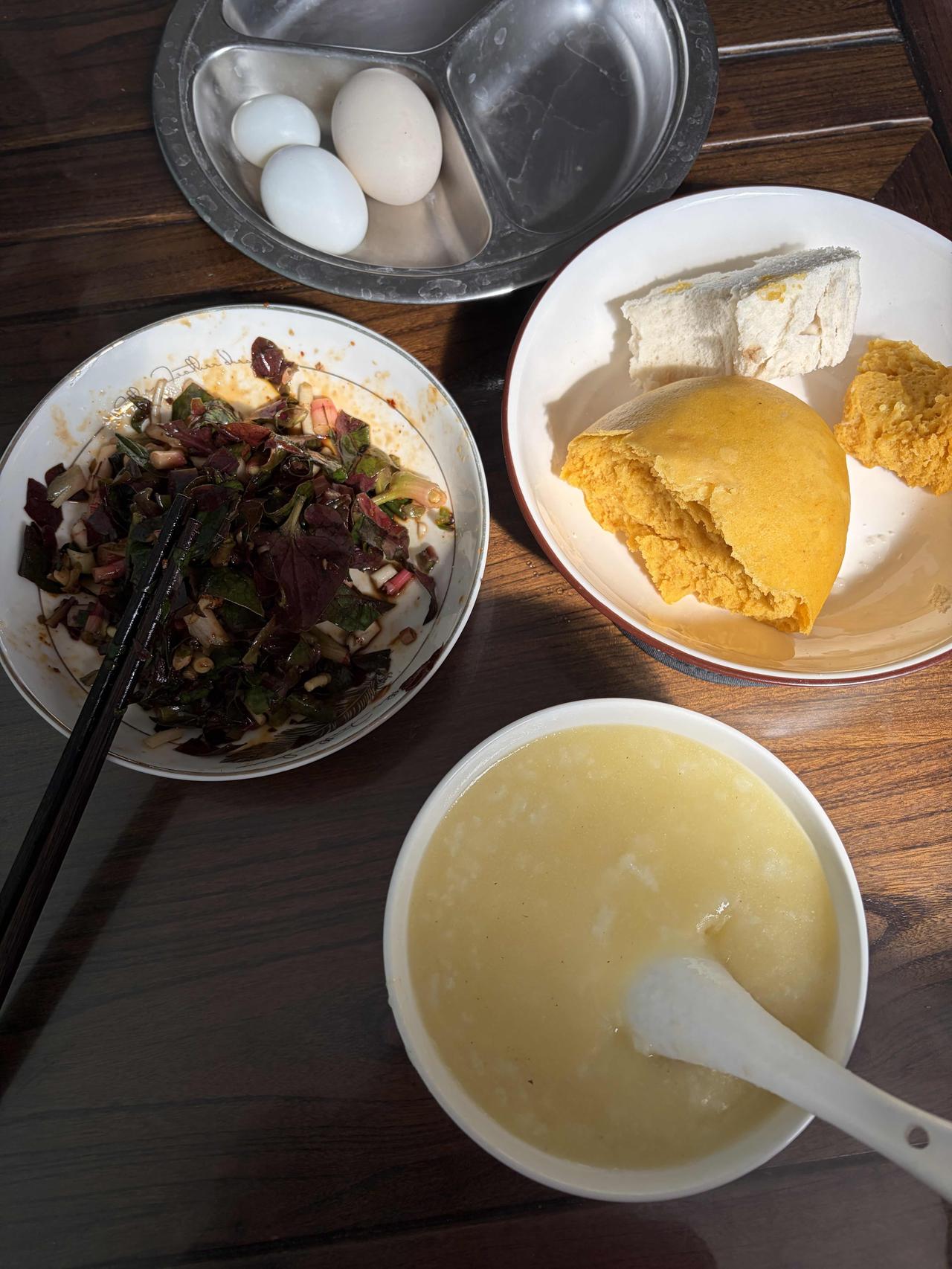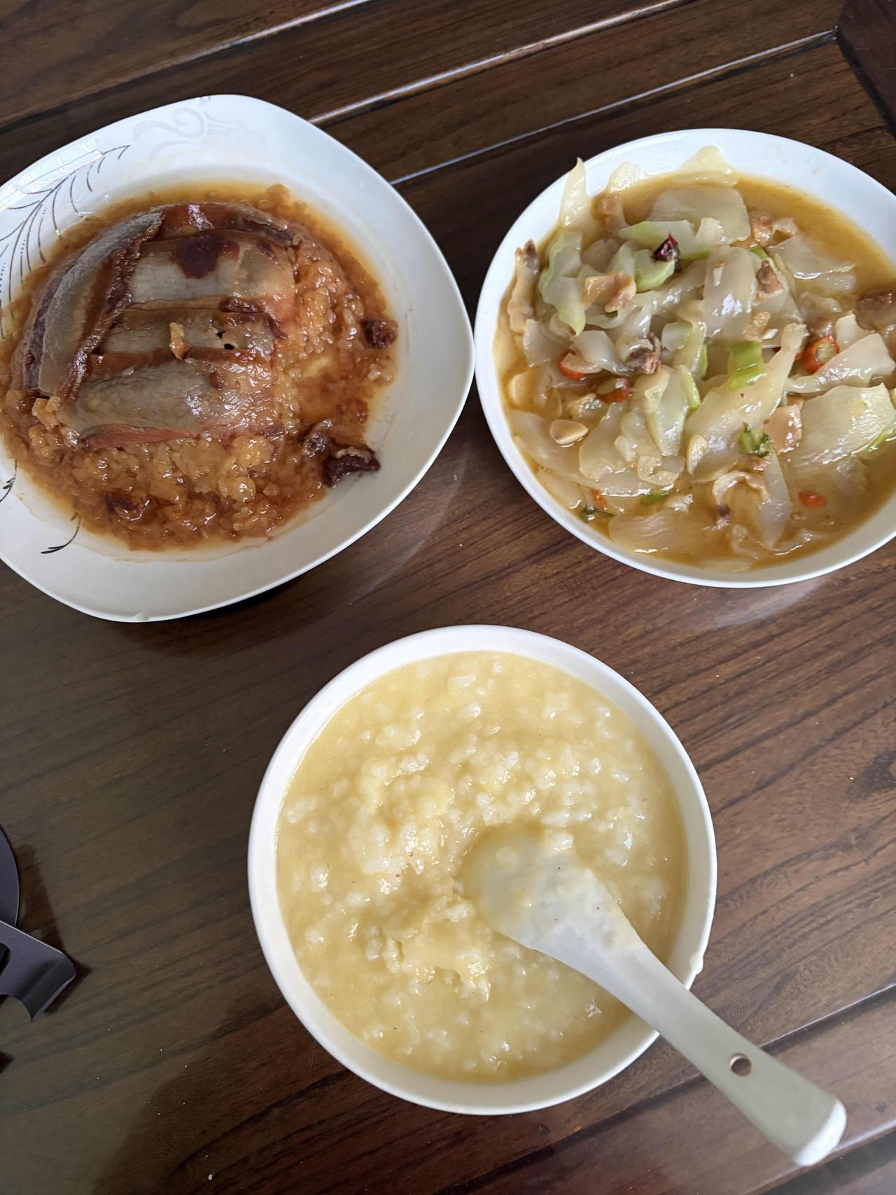 在家吃饭:一碗粥炒一份青菜一块馒头,我便觉得心满意足。
