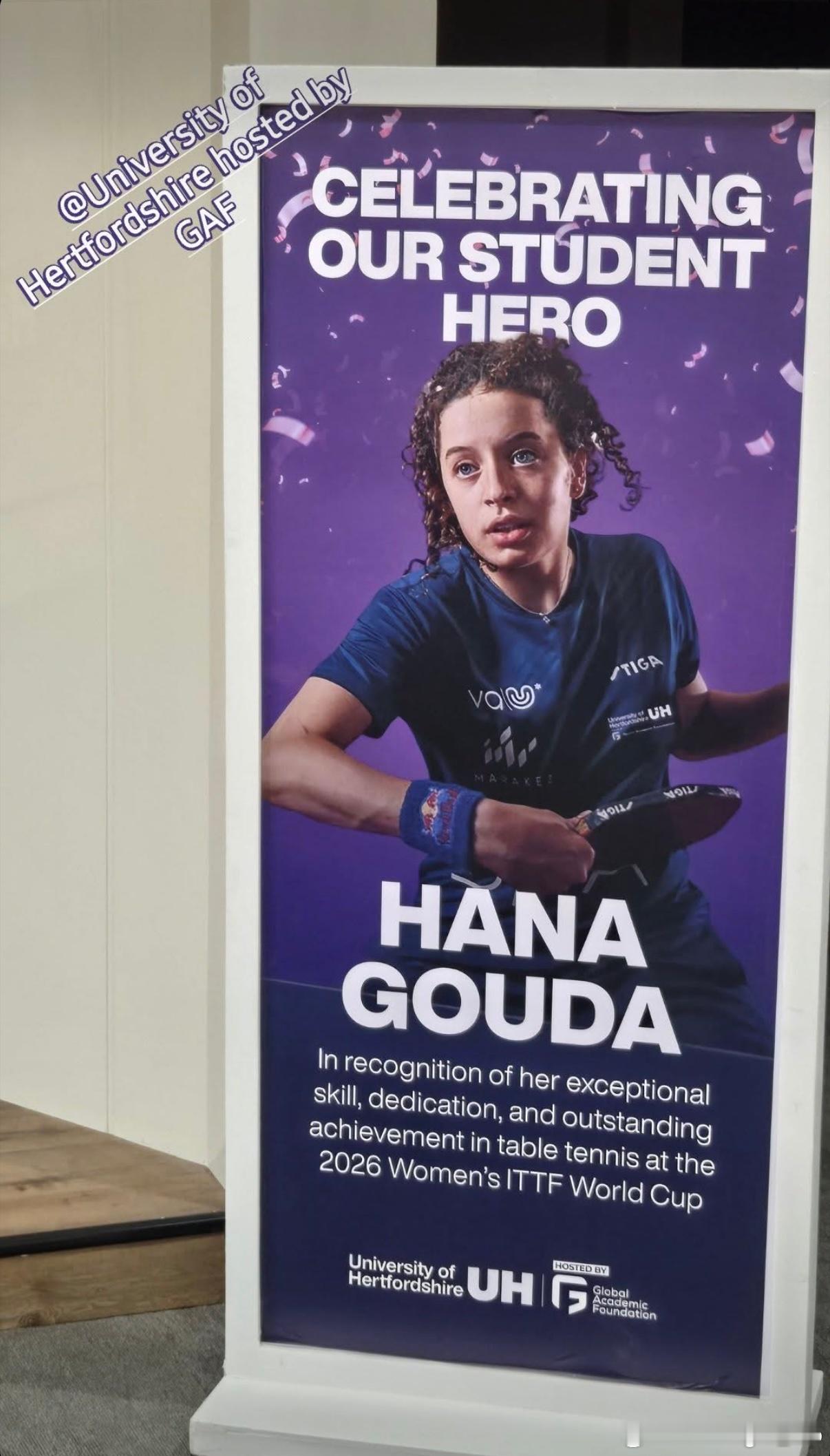 汉娜·高达所就读的大学:“致敬我们的学生英雄汉娜·高达表彰她在2026年国际乒联女子世界杯中的卓越技能、不懈努力和杰出成就”