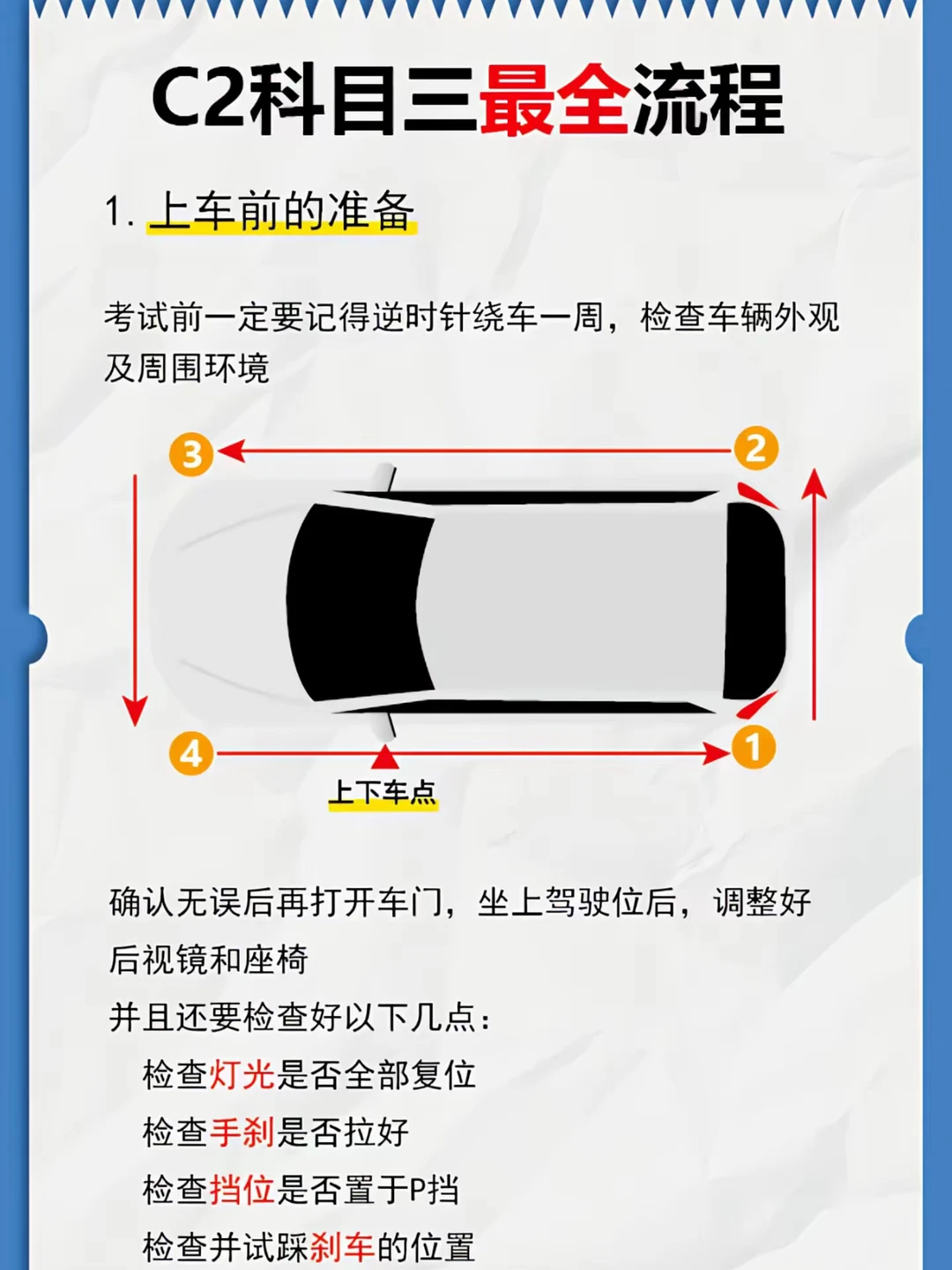 上车准备:调整座椅镜子,复位灯光,绕车一周灯光模拟:十三个灯光随机抽取六项