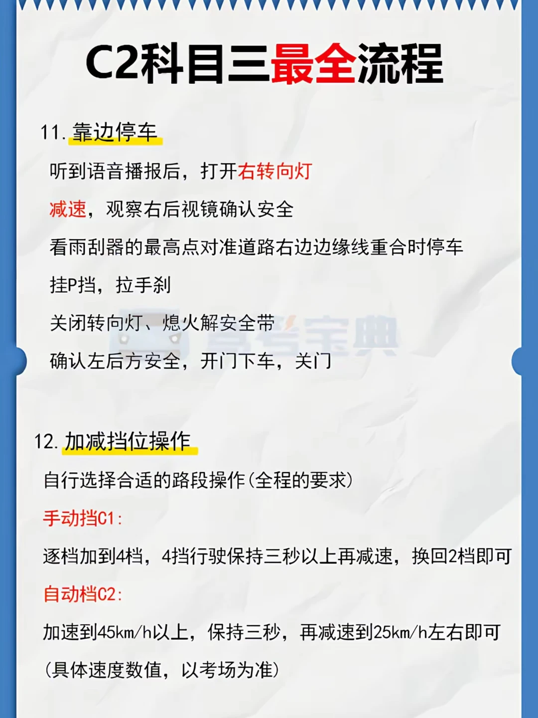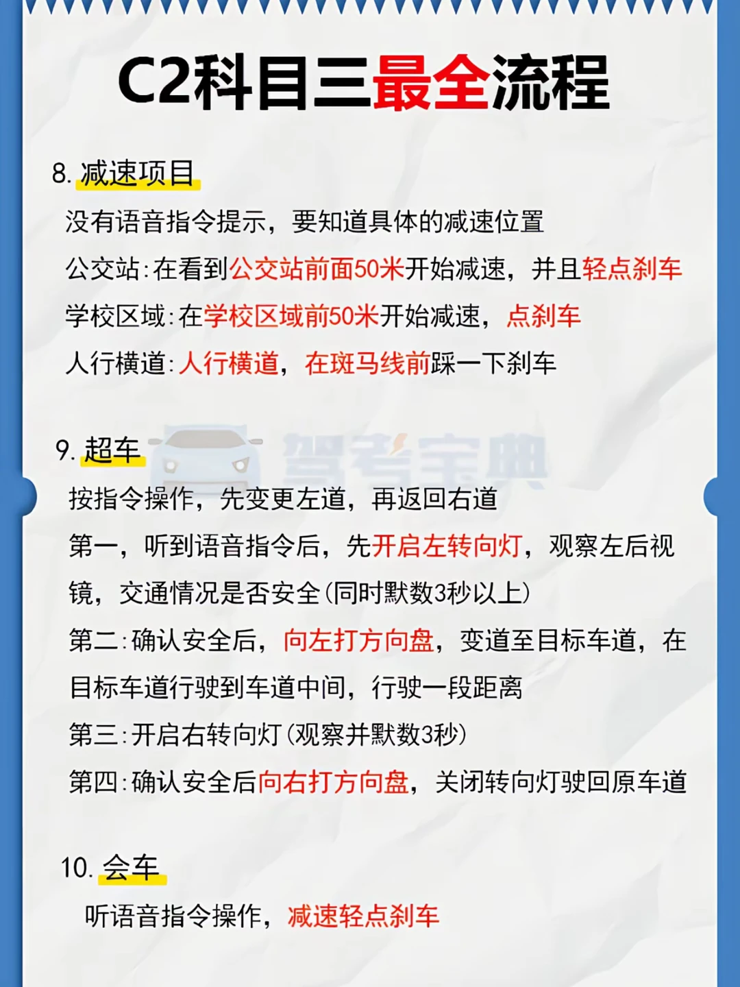 超车项目:按指令操作,先变更左道,再变回原车道加减档位:(没语音播报)自动档加速40以上保持三秒以上,再减速手动挡逐档加到4档,时速40以上保持三秒以上,再减到2档