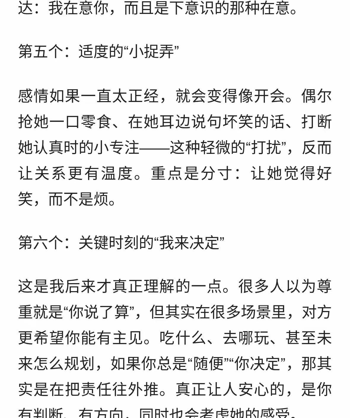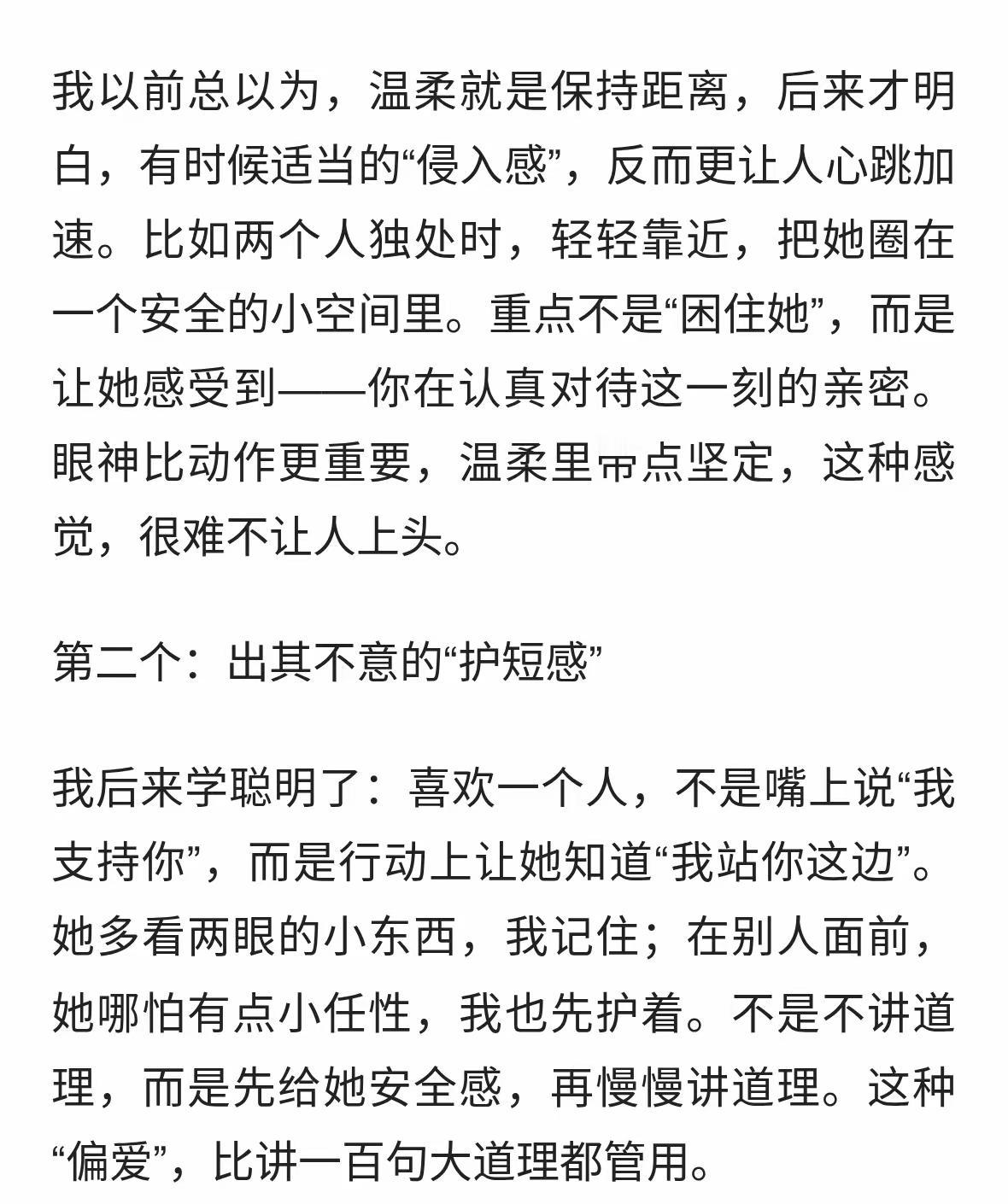 比如在过马路时轻轻拉她的手、在拥抱时稍微控制她的身体方向,表现出你的主导感和保护欲,让她觉得你有安全感又有力量。