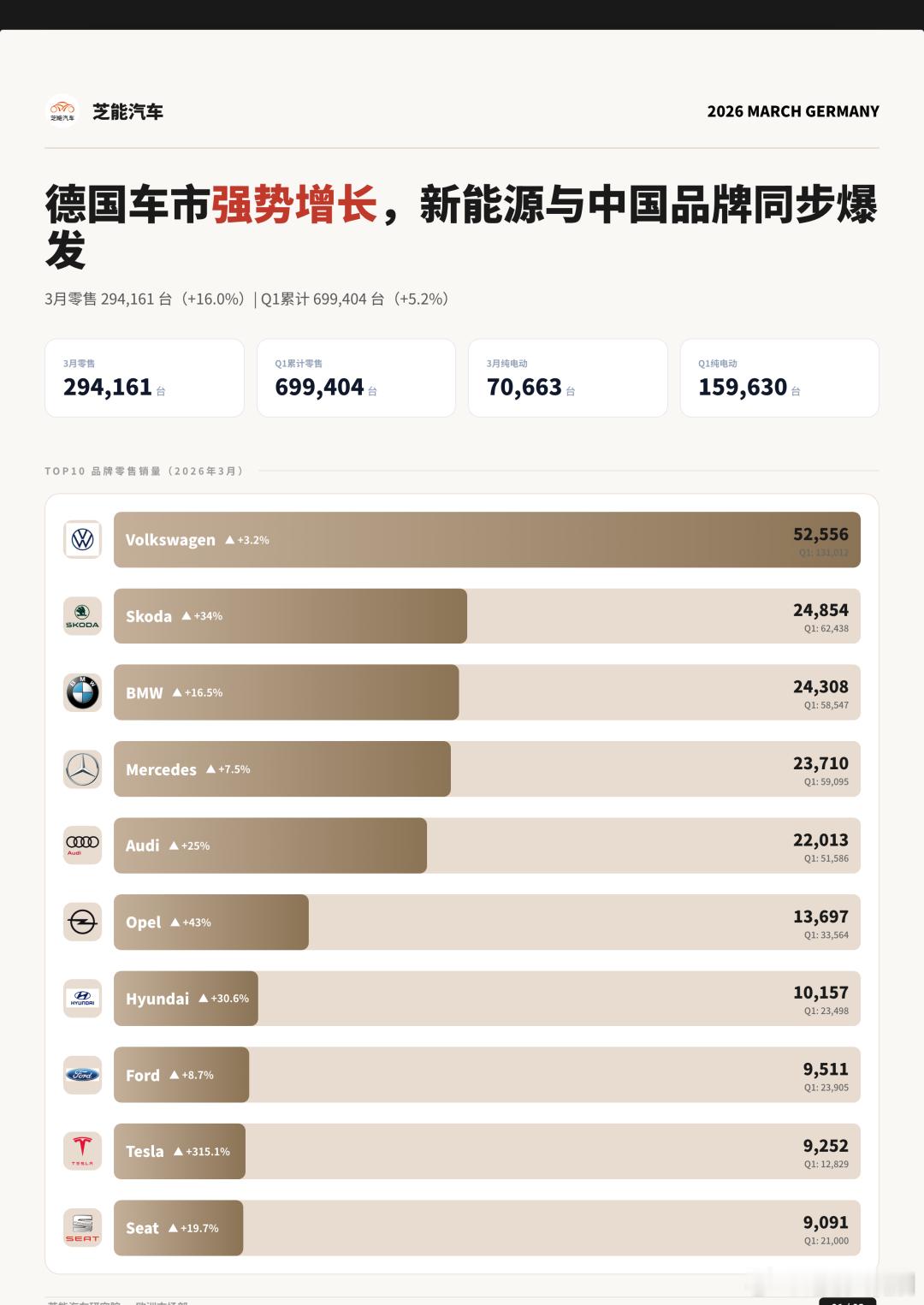 2026年3月,德国车市单月新车注册29.4万辆,同比增长16%;一季度累计69.9万辆,同比增长5.2%。