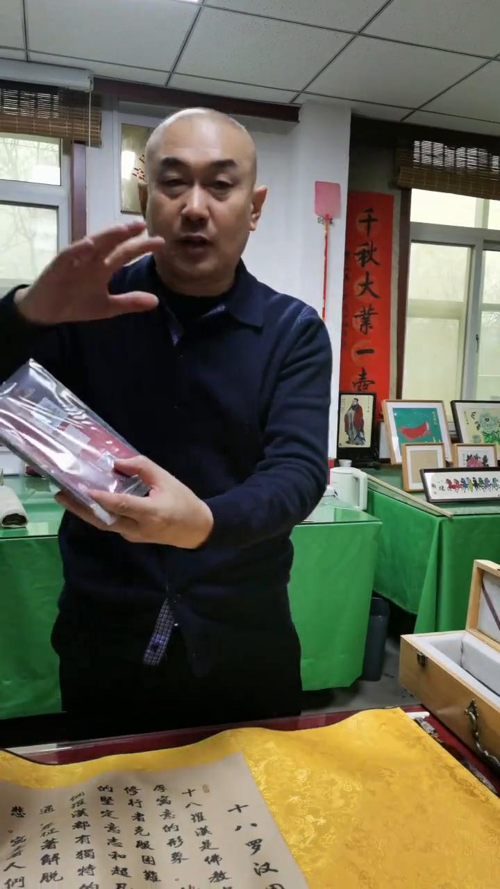 十八罗汉被老板借来了,一会过来拿。大家看一下这是外包装,特别精致的包装。这是作品,十八罗汉。简单的展示一下,这是这幅作品的收藏证书。把情绪给客户一定要拉满,把该做的都要做好。也感谢老板对传统技艺的支持。十八罗汉被老板结缘,感谢支持。