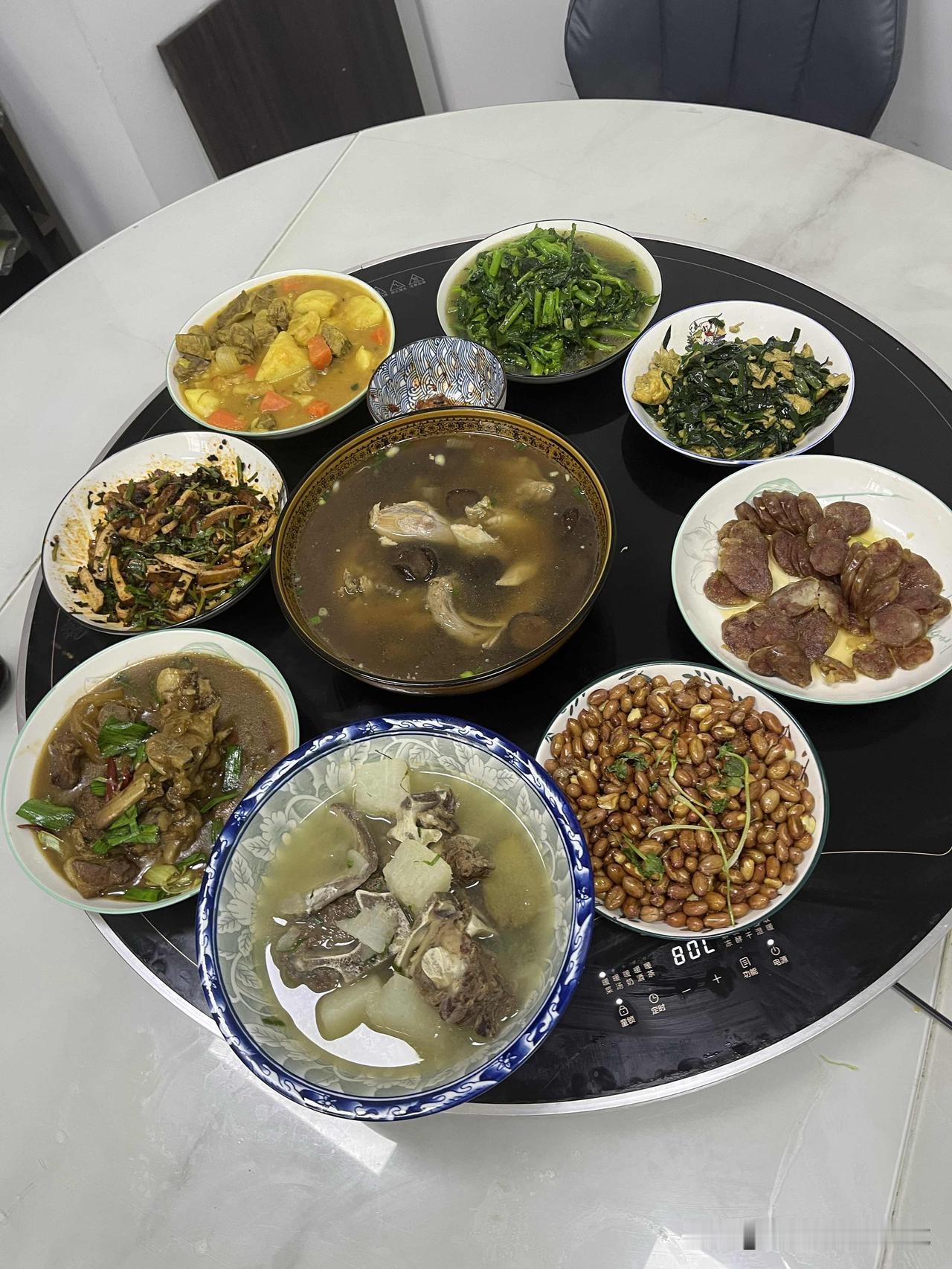 做菜也是轻车熟路,对于荤素菜的搭配,还有厨具用品的存放地也了如指掌。还有电磁炉的火力调节都做到心中有数。八个菜左右,1个半小时基本完成,剩下时间搞厨房卫生。
