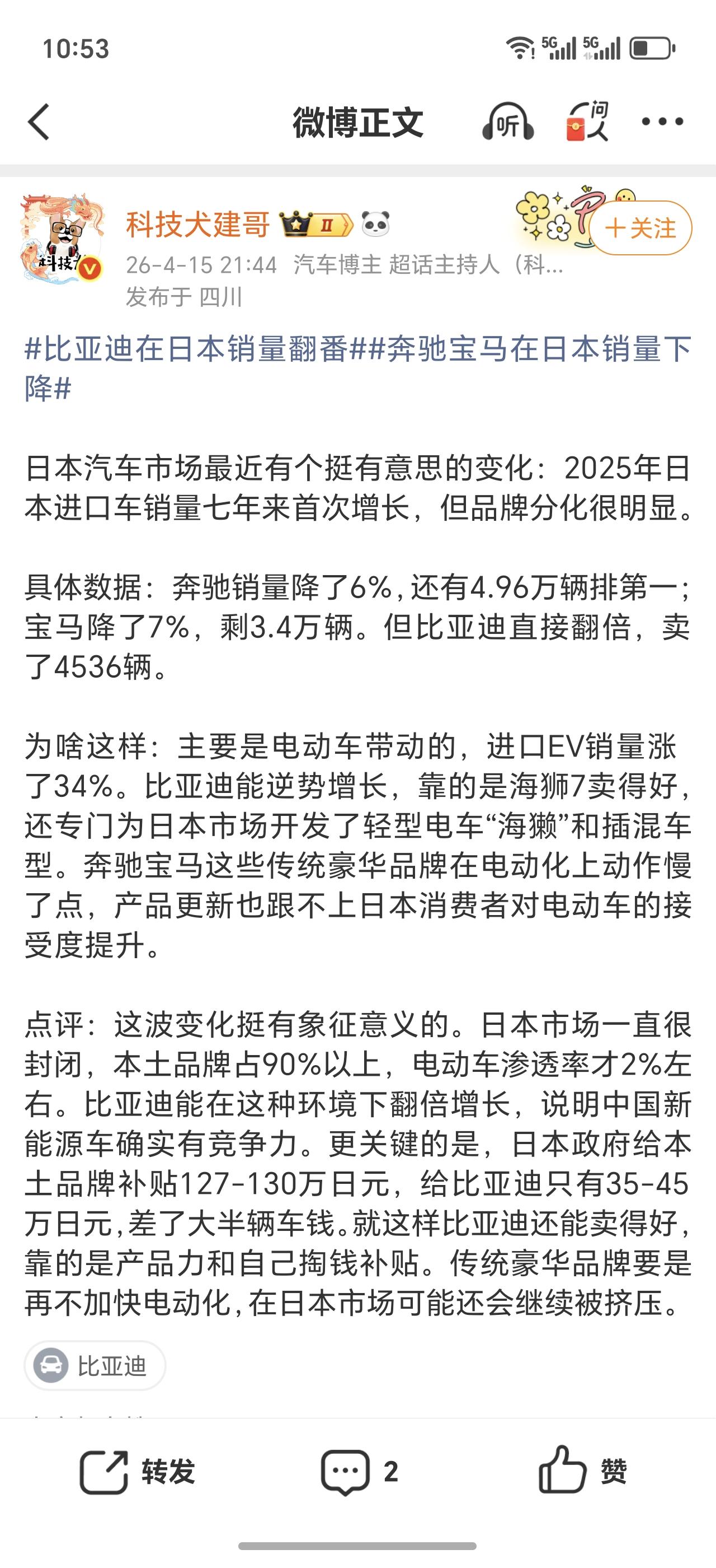 这一成绩离不开二十年市场深耕与自身技术优势的加持,作为全面进入日本的中国车企,比亚迪布局多款新能源车型并推出日本专属车型,同时搭建 70 个销售据点完善服务。凭借技术实力与本土化运营,比亚迪在日本市场稳步突围,持续擦亮中国汽车品牌名片。【来自懂车帝车友圈】