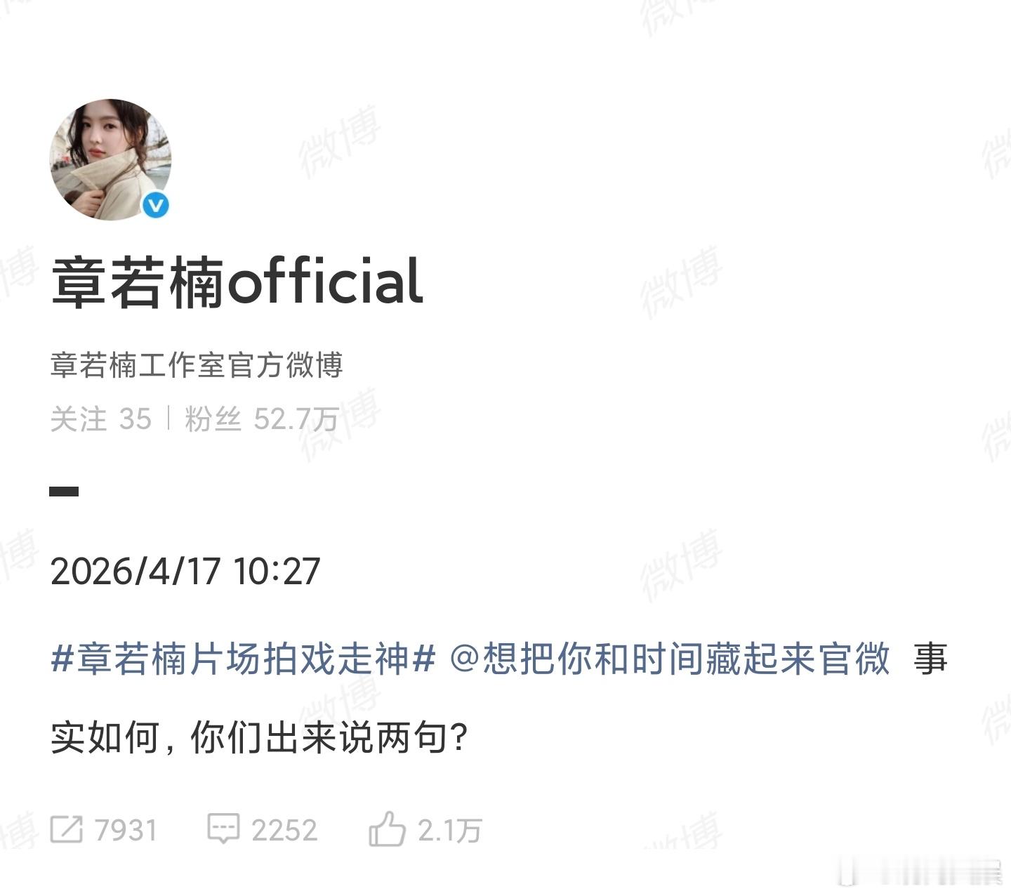 此前,网传新剧片场路透。章若楠开拍后回头回应粉丝, 17日上午,公开喊话《想把你和时间藏起来》官微:“事实如何,你们出来说两句?”