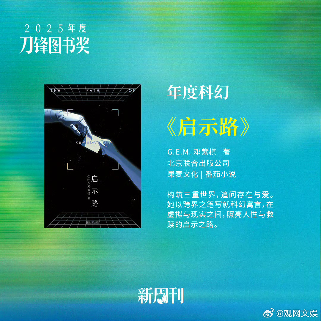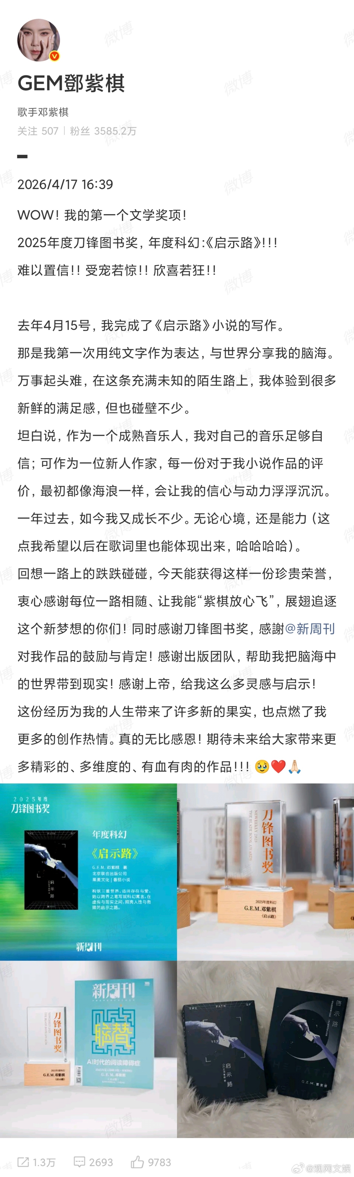 邓紫棋小说启示路获刀锋图书奖 4月17日,发文回应其小说《启示路》获得2025年度刀锋图书奖年度科幻,“难以置信!!受宠若惊!!欣喜若狂!!”