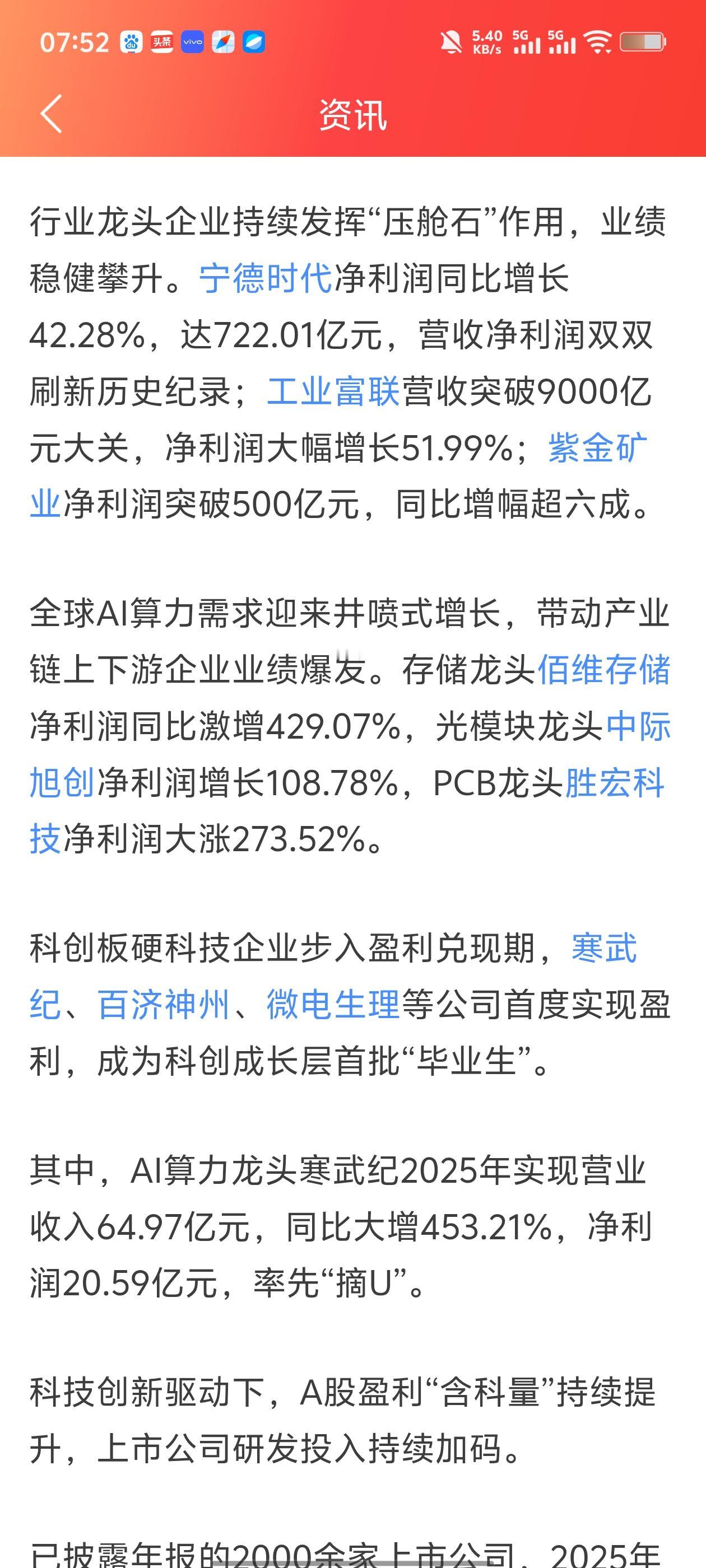 - 科技公司集体“兑现”:AI算力、光模块、存储这些赛道,业绩直接爆发,佰维存储利润涨了4倍,中际旭创、胜宏科技翻倍增长。科创板的寒武纪也扭亏为盈了,说明科技不是纯概念,是真的在赚钱了。