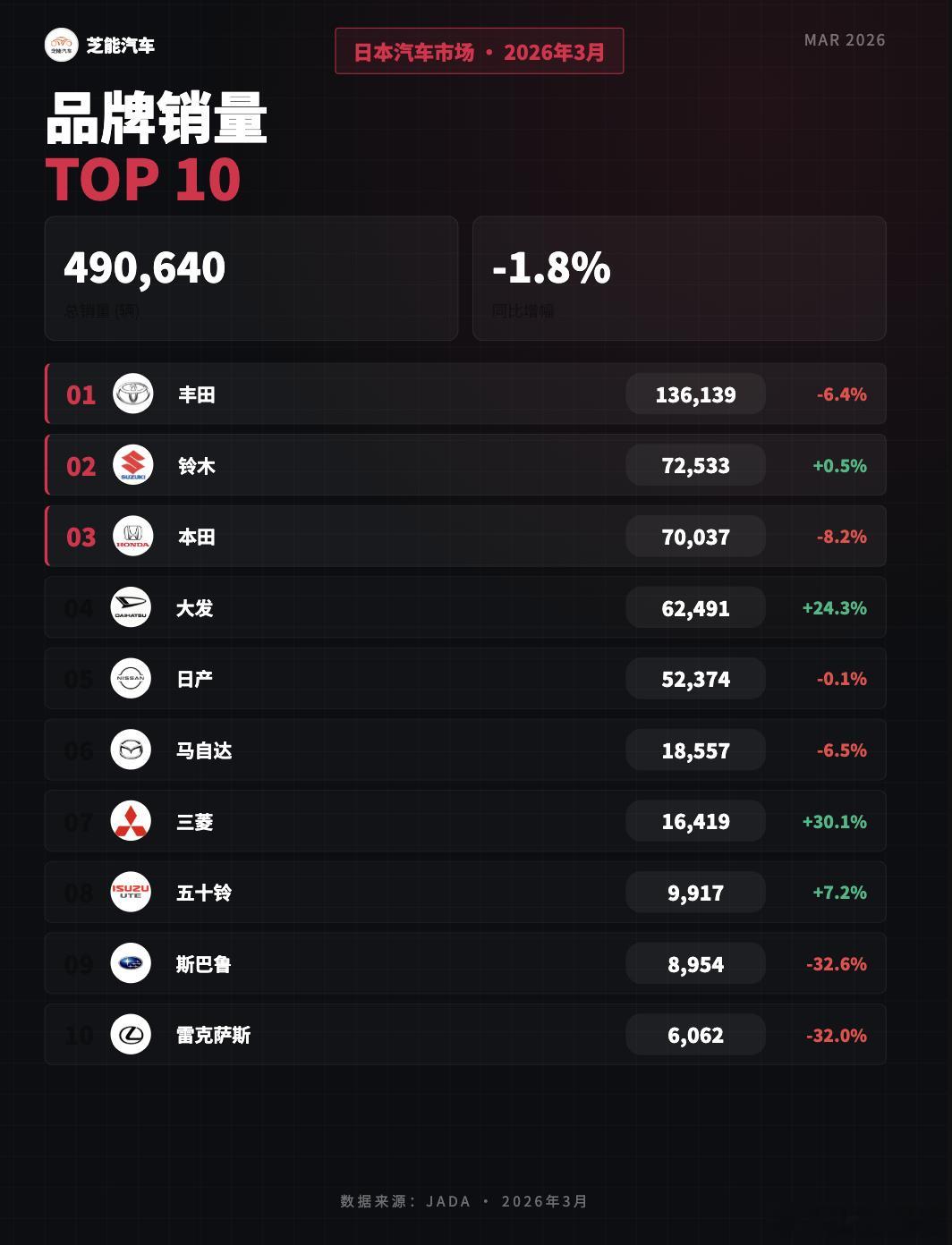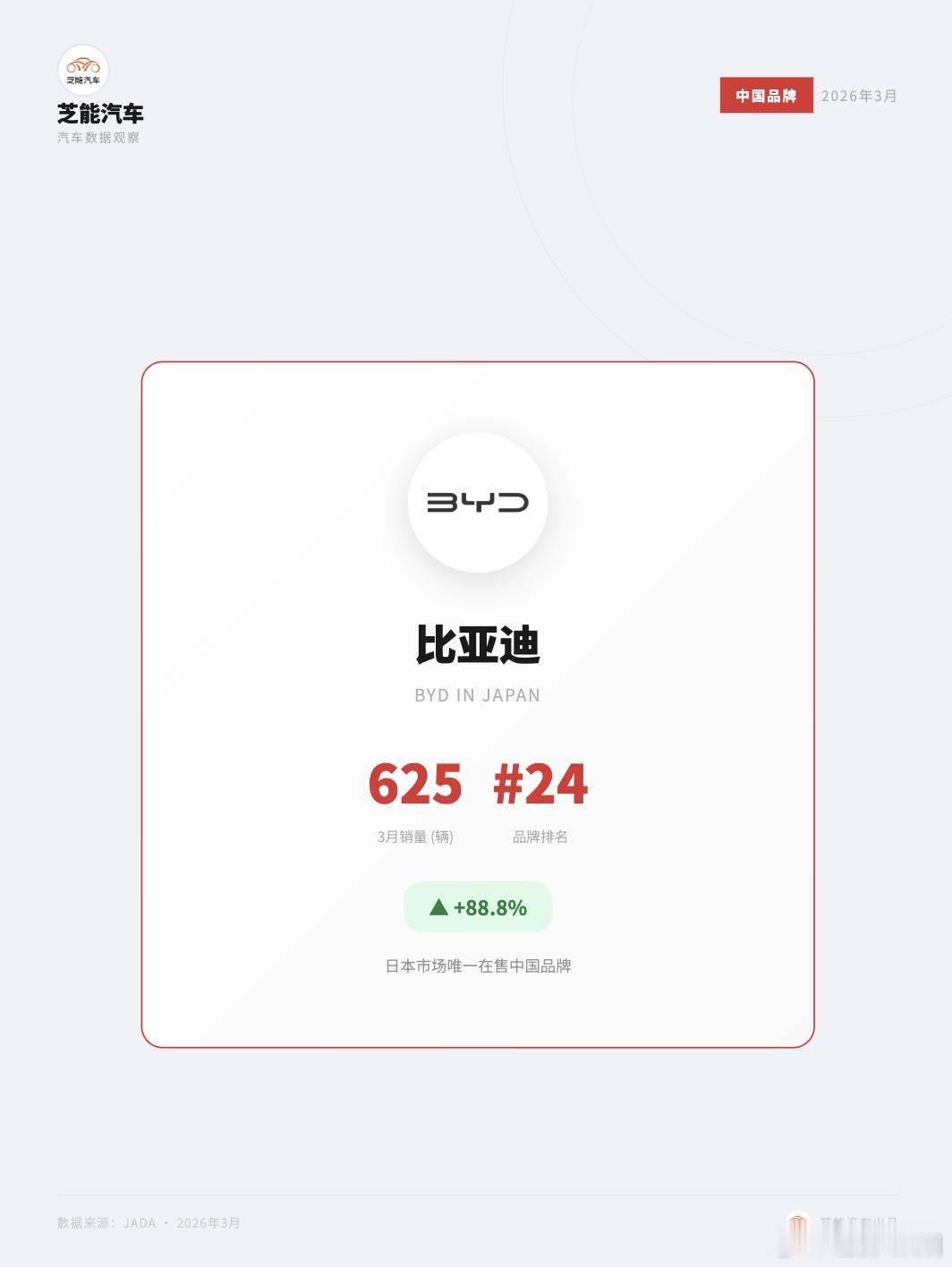 亚洲车市|日本2026年3月:比亚迪销量625台