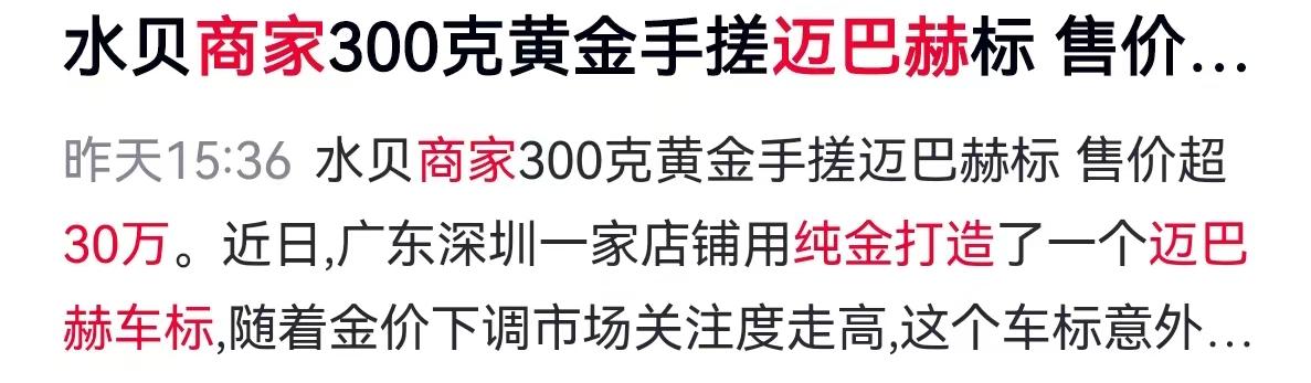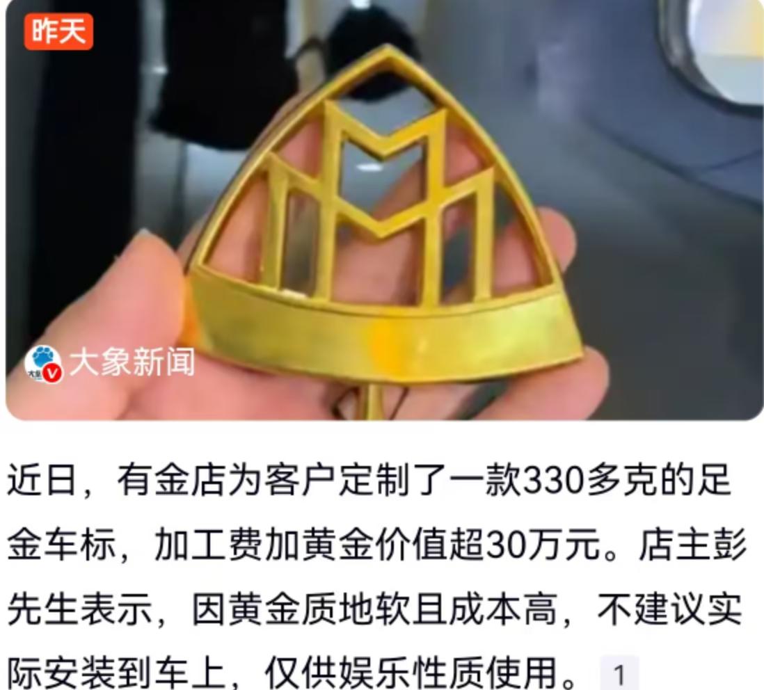 广东深圳水贝,向来是国内黄金市场的风向标。这几天,水贝一家金店店长彭先生手里出的一件活儿,直接把网友的注意力拉满了。一位客户拿着金料找上门,要求定制一个迈巴赫车标。最终成品出炉,重量足足有330多克,加上加工费和黄金本身的价值,整体售价超过了30万元。