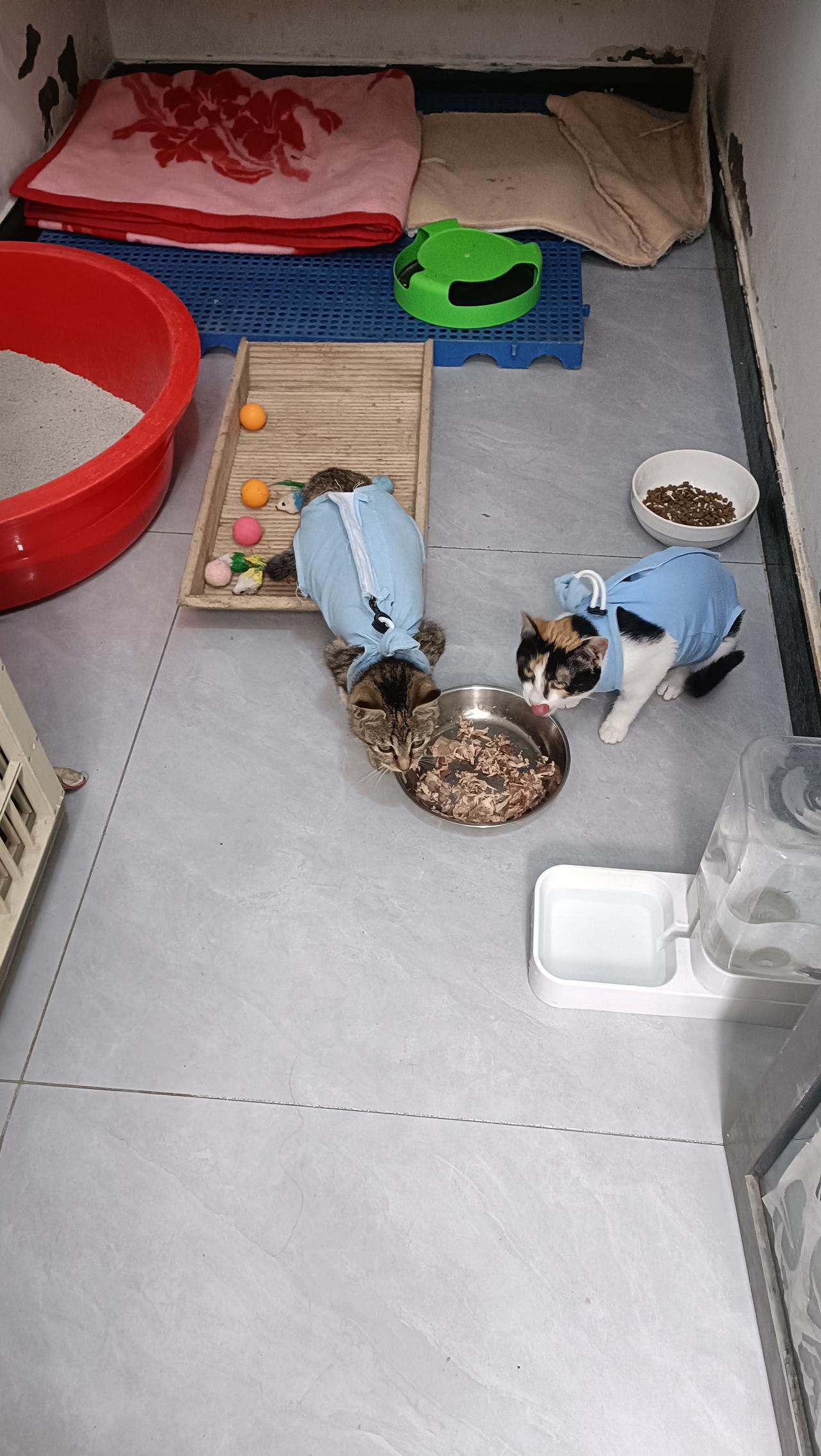 今天是小三花和小彩狸绝育康复后拆线的日子,这七天真是度日如年,中途小彩狸还把防护服给挣脱了,我赶紧又给它重新穿上,检查伤口隐隐发红,是被它舔的,还好没有裂开。顺利拆完线,小三花恢复良好,小彩狸伤口还是有些微微发红,医生交待说防护服还需要穿两天才能脱掉。回到家,我赶紧拿出罐头安慰两小只,它俩当时可是吓得喵喵直叫呢!