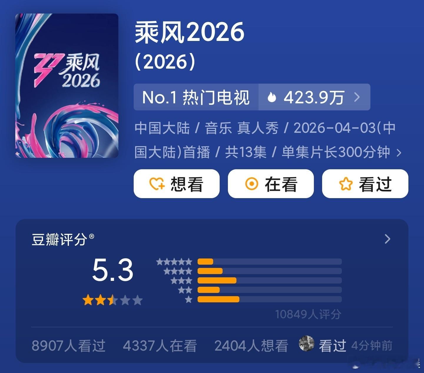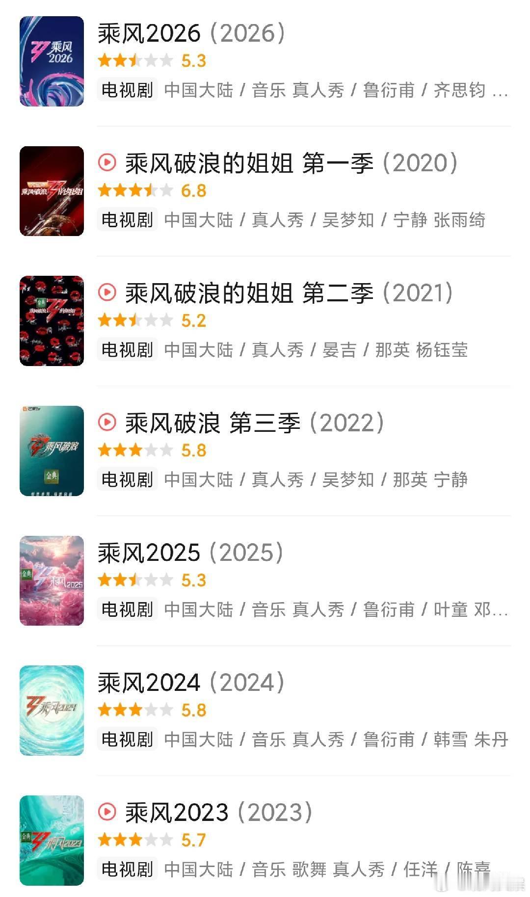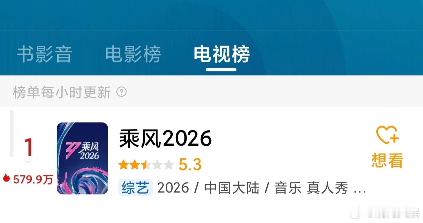 乘风2026豆瓣5.3分李小冉、王濛、孙怡、曾沛慈、张月、阚清子、乌兰图雅、温峥嵘等参演的年度大热综艺《乘风2026》(浪姐7)豆瓣开分5.3,分数与往届6季相比差别不大,目前电视榜单热度第一,大家觉得高了还是低了?《乘风2026》
