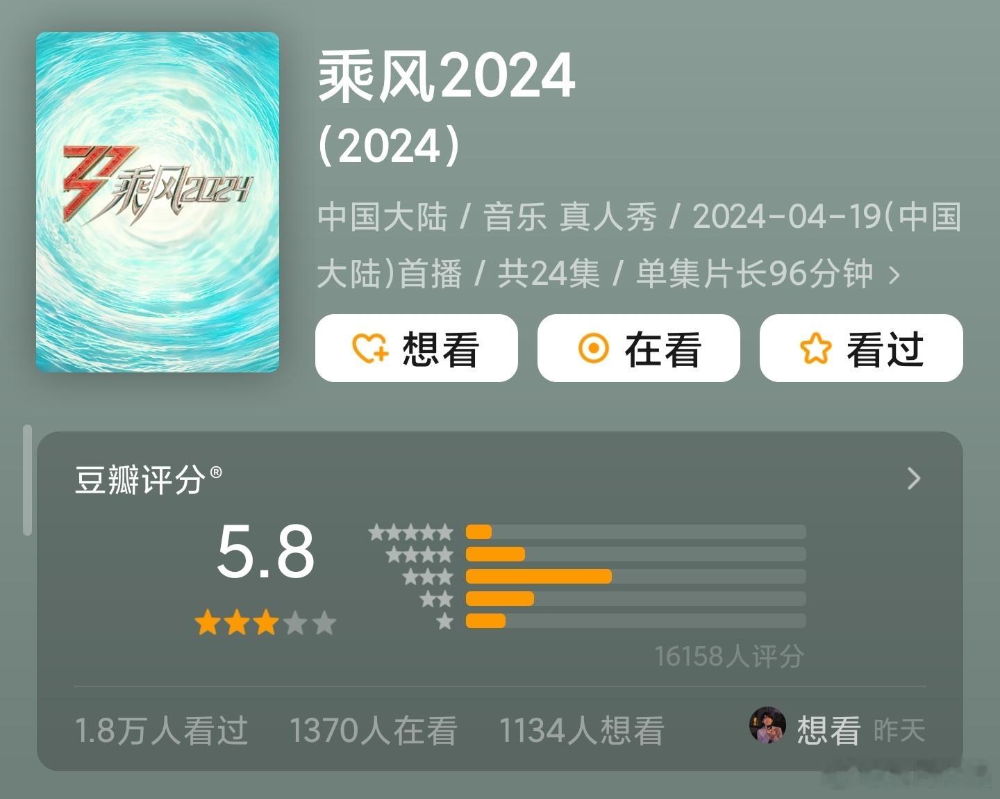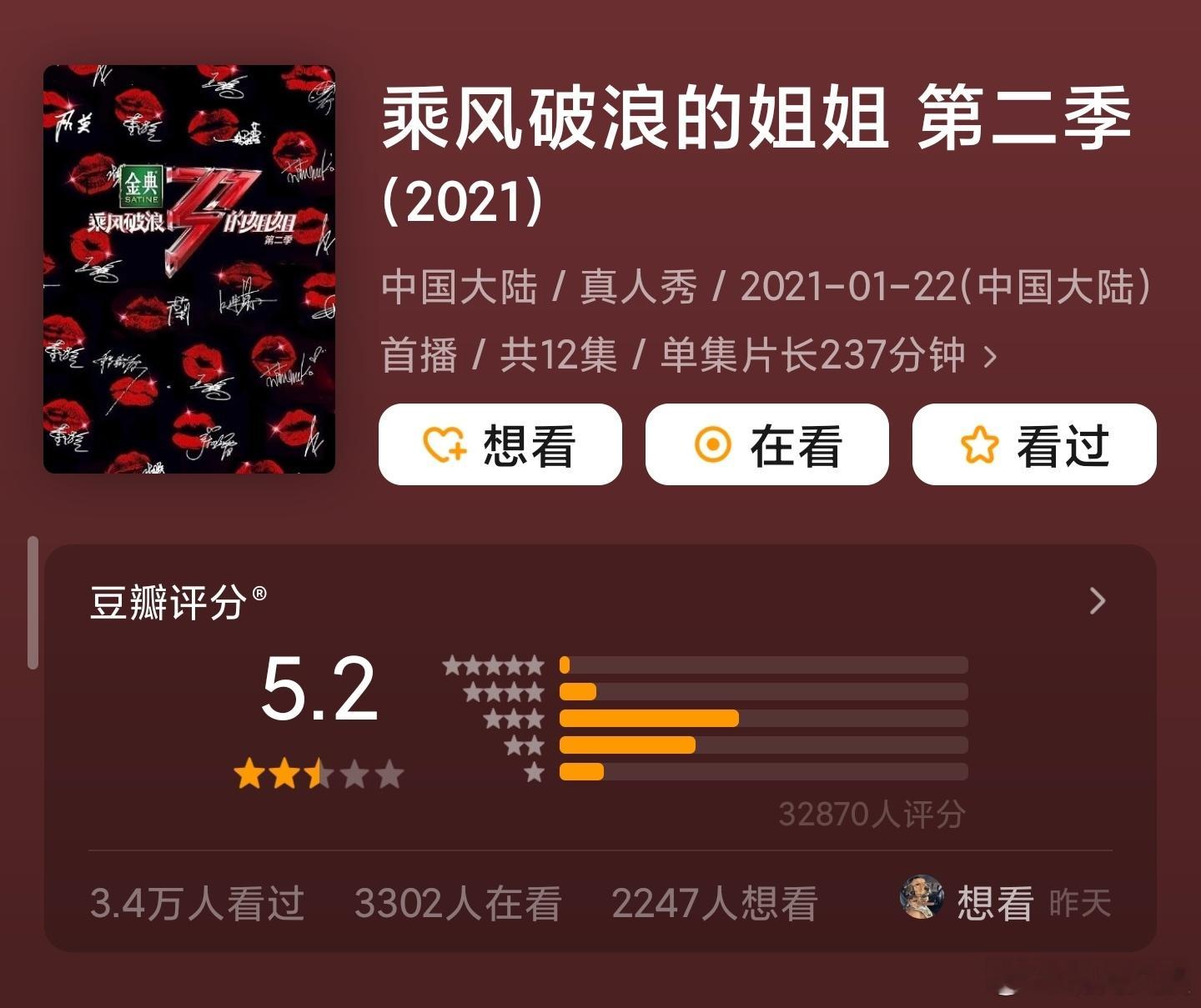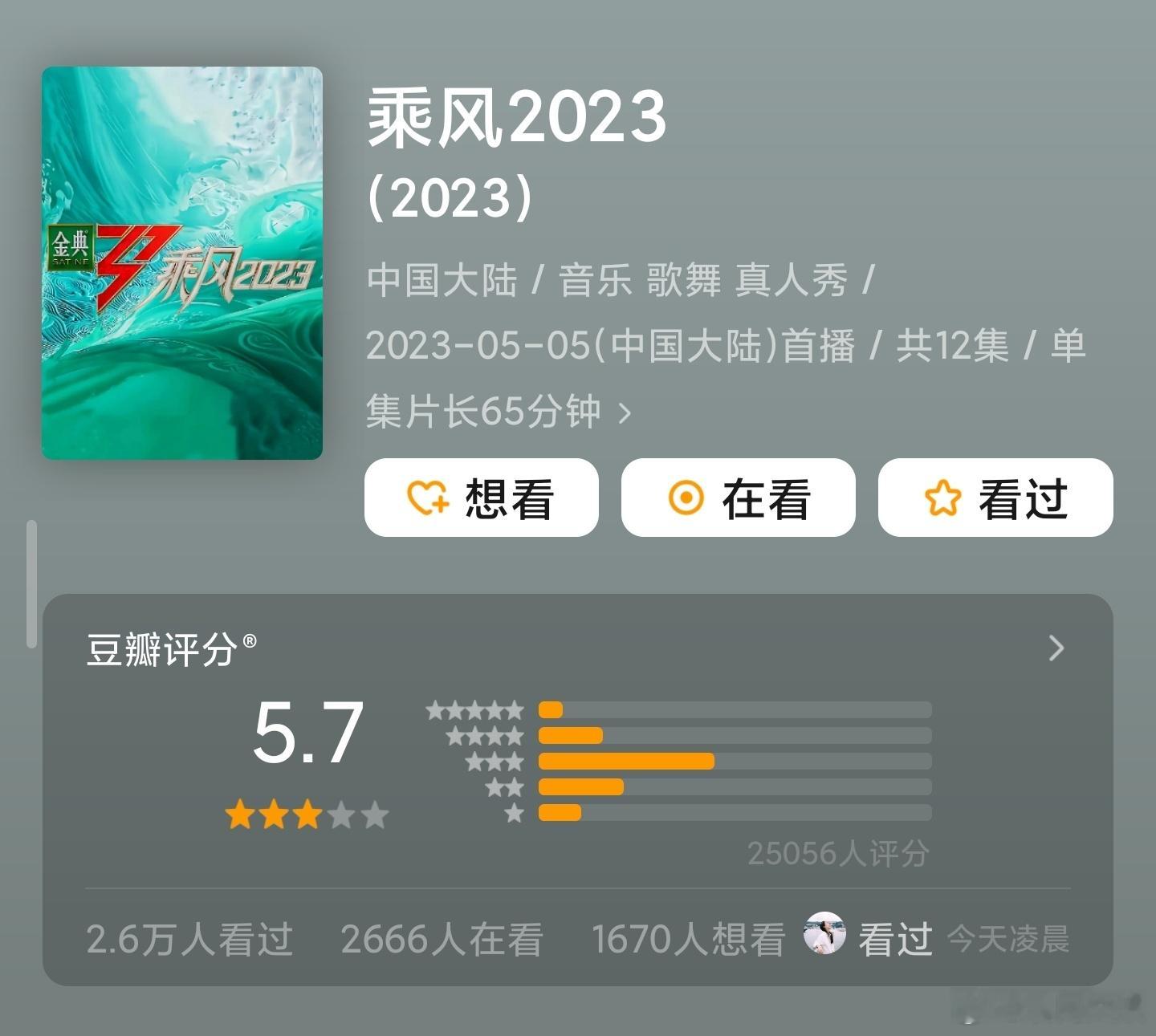 乘风2026豆瓣5.3分李小冉、王濛、孙怡、曾沛慈、张月、阚清子、乌兰图雅、温峥嵘等参演的年度大热综艺《乘风2026》(浪姐7)豆瓣开分5.3,分数与往届6季相比差别不大,目前电视榜单热度第一,大家觉得高了还是低了?《乘风2026》
