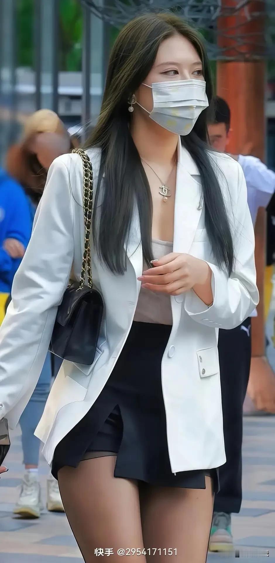 都市时尚女郎,白西装搭配黑短裙,自信满满走在街头!👠💄👗