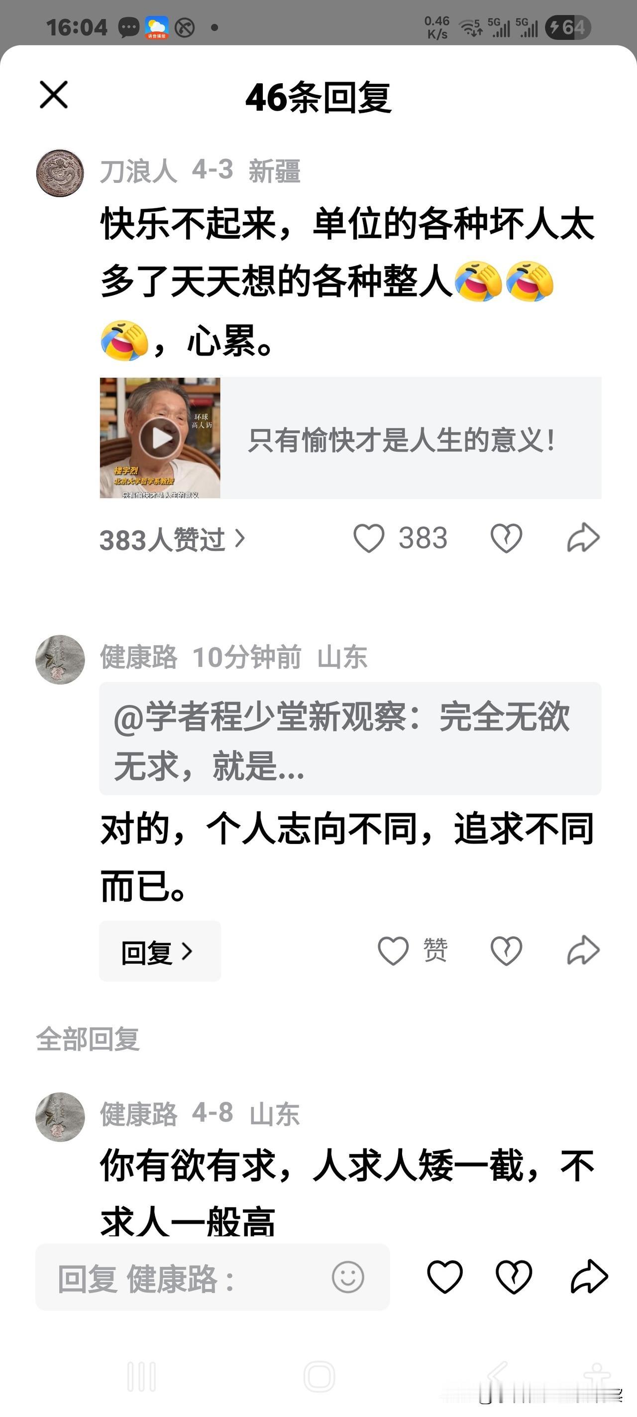 今天在头条一个标题为《只有愉快才是人生的意义!》的视频下,有一个网友发评论说: