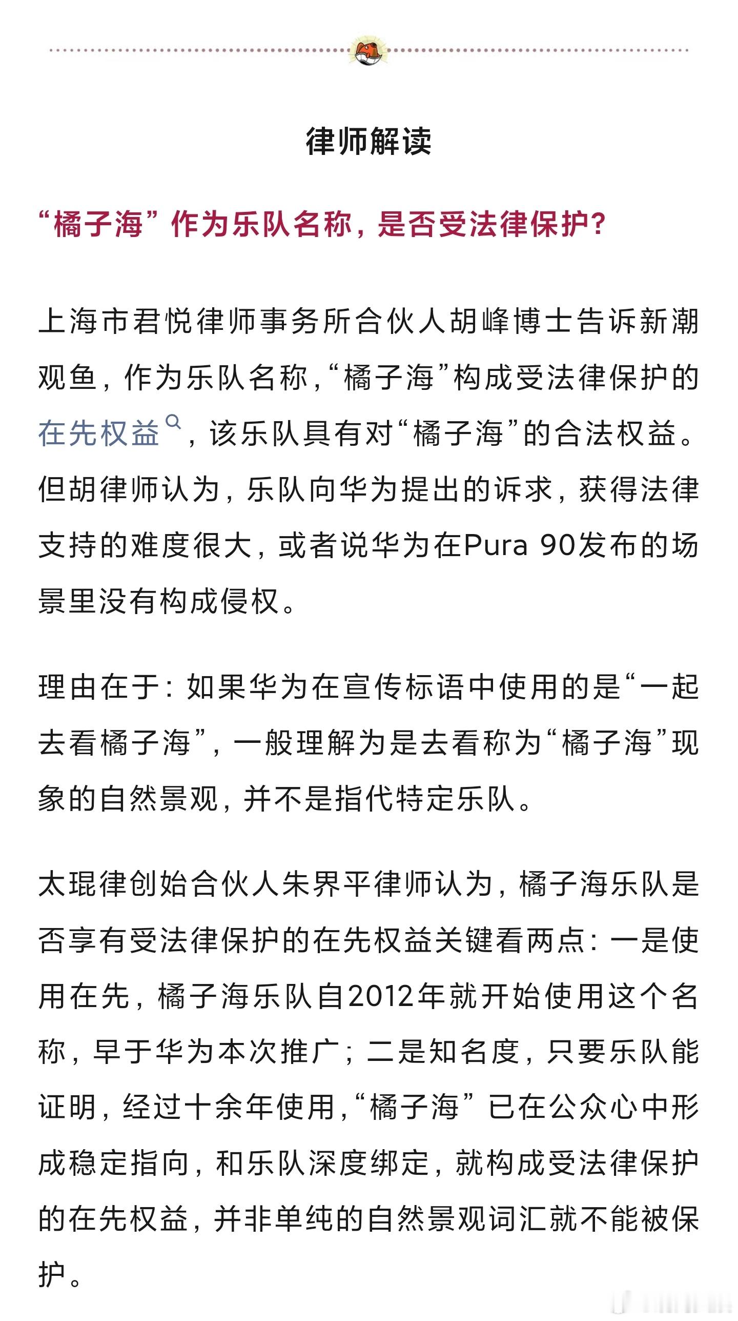 太琨律创始合伙人朱界平律师认为,橘子海乐队是否享有受法律保护的在先权益关键看两点:一是使用在先,橘子海乐队自2012年就开始使用这个名称,早于华为本次推广;二是知名度,只要乐队能证明,经过十余年使用,“橘子海” 已在公众心中形成稳定指向,和乐队深度绑定,就构成受法律保护的在先权益,并非单纯的自然景观词汇就不能被保护。