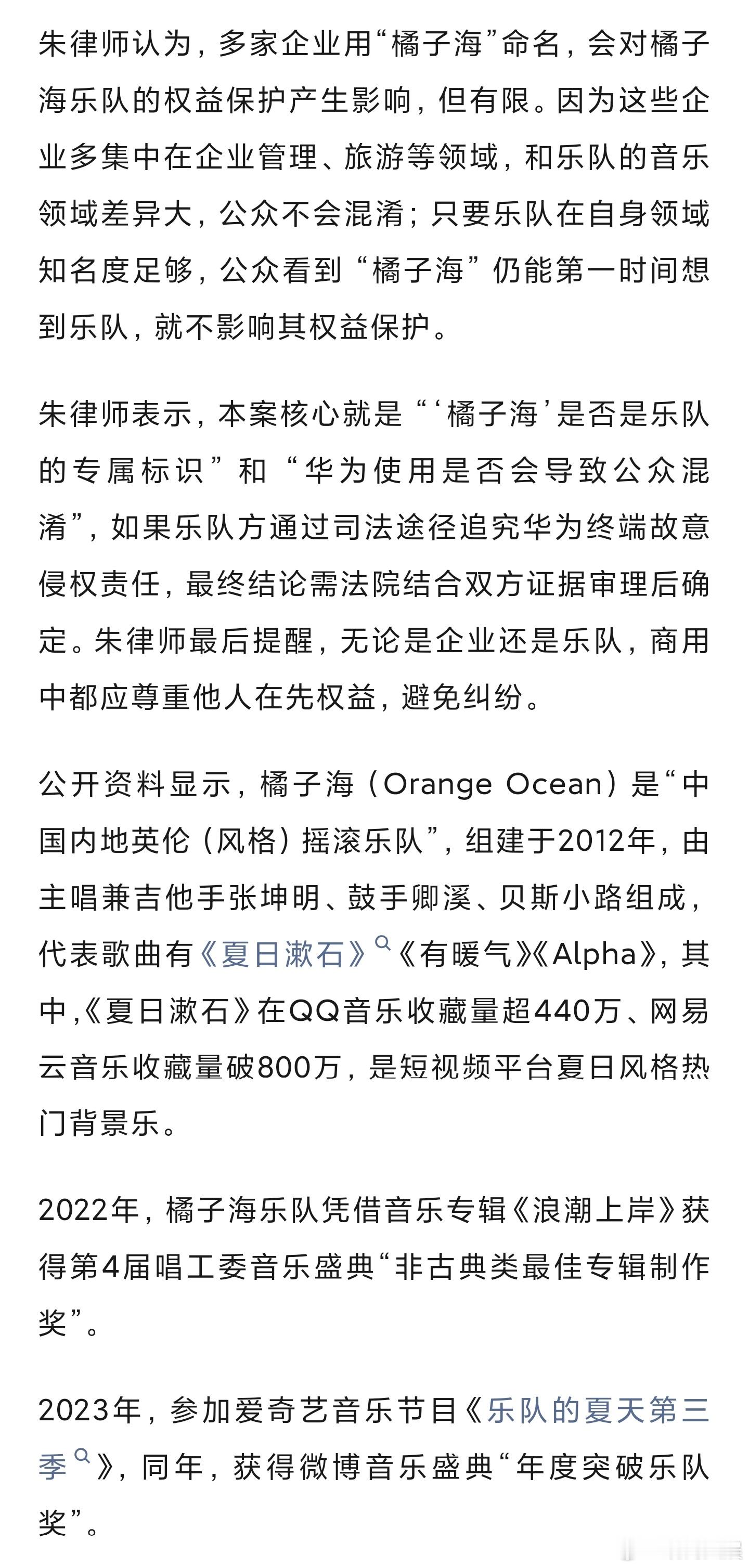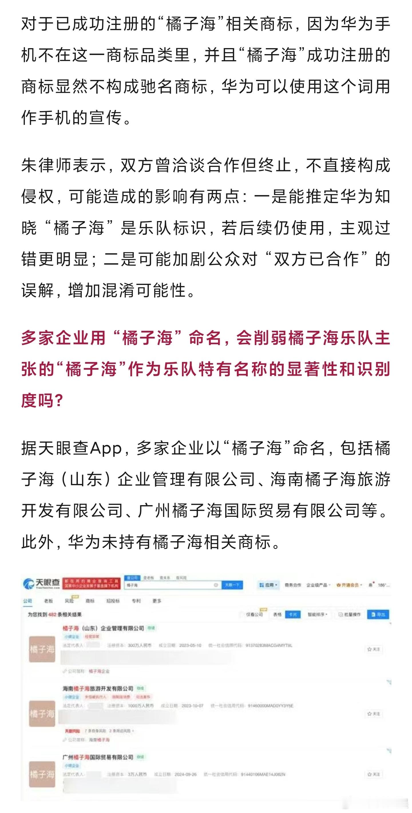 朱律师认为,如果 “橘子海” 经乐队长期使用,公众看到先想到乐队,乐队就有权禁止他人在易混淆的商业场景使用。华为是否侵权,核心看两点:一是公众会不会误以为双方有关联,二是华为是否明知该名称与乐队的关联仍使用,尤其是双方曾洽谈过合作,若合作终止后仍使用,会增加侵权认定的可能。至于乐队提出的停止侵权、协商赔偿诉求,若能证明华为使用导致公众混淆、乐队受损,就会得到支持;公开致歉则要看华为的行为是否损害了乐队名誉,若仅涉及商业权益,致歉诉求可能难以成立。