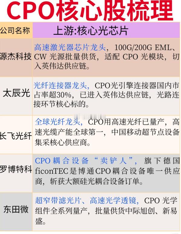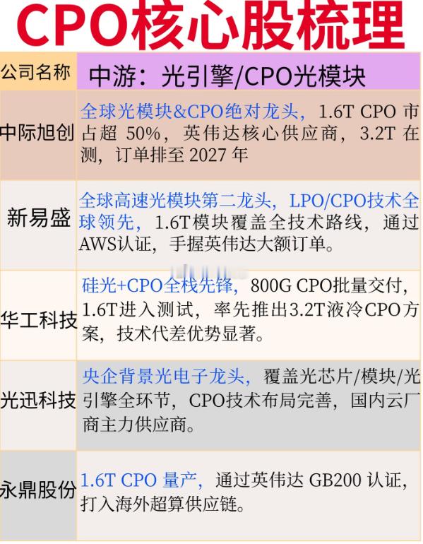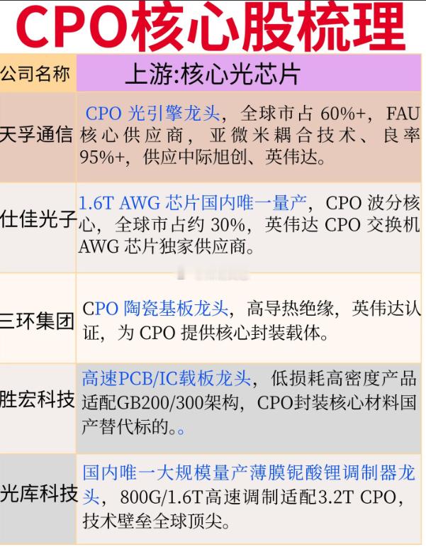 CPO赛道:AI算力互联的“高速公路”革命当AI大模型的算力需求呈指数级爆发,传统电互联已成为性能瓶颈,CPO(共封装光学)技术正成为打通算力集群“最后一公里”的关键。近期,国内数据中心高速互联技术政策密集出台,叠加英伟达等巨头加速CPO商用落地,这条赛道迎来了技术与需求的双重共振。赛道核心逻辑拆解CPO的本质,是将光引擎与交换机芯片直接封装,通过缩短电信号传输距离,实现带宽提升与功耗下降,解决800G/1.6T时代的互联瓶颈。相比传统光模块,CPO可降低功耗30%以上,是支撑AI算力集群高效运行的“高速公路”,市场空间随AI算力需求扩张持续爆发。 产业链核心环节梳理1. 上游核心光芯片:技术攻坚的“卡脖子”环节天孚通信、仕佳光子是CPO光引擎与波分芯片的核心供应商,三环集团、胜宏科技提供陶瓷基板与高速PCB,光库科技、源杰科技在调制器与激光器芯片领域实现突破,核心壁垒在于微耦合工艺与良率控制,成长空间随CPO渗透率提升持续打开。2. 中游光引擎/CPO光模块:赛道竞争的主战场中际旭创、新易盛是全球CPO光模块龙头,1.6T产品市占率领先,华工科技、光迅科技在液冷CPO方案上形成差异化优势,核心壁垒在于技术路线迭代与巨头客户认证,订单排期已延伸至2027年,成长空间确定性极强。3. 下游算力设备/云厂商应用:需求落地的关键场景工业富联、中兴通讯为CPO交换机与服务器提供代工支持,紫光股份、锐捷网络推出适配CPO的高速交换机,核心壁垒在于设备集成能力与客户资源,直接受益于AI算力集群的大规模建设。行业趋势与风险提示当前CPO赛道呈现三大趋势:1.6T产品进入规模化商用,液冷CPO方案成为主流方向,硅光与CPO技术融合加速推进。但需警惕风险:技术迭代速度快,部分厂商可能面临路线错配风险;客户认证周期长,量产进度不及预期;海外巨头专利壁垒较高,国产替代进程存在不确定性。CPO赛道的竞争,本质是光芯片、封装工艺与客户资源的综合比拼。在AI算力互联需求的驱动下,具备全链条技术优势与巨头绑定能力的企业,将在这场算力互联革命中抢占先机。股市有风险,投资需谨慎。