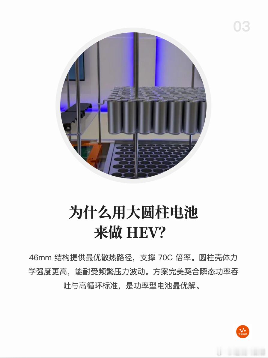 为什么是“大圆柱+小电量”?46mm 结构提供最优散热路径,支撑 70C 倍率。圆柱壳体力学强度更高,能耐受频繁压力波动。HEV主要获取能量的来源是刹车过程中的能量回收和发动机发电,70C倍率、5万次循环这些指标很有意义的。
