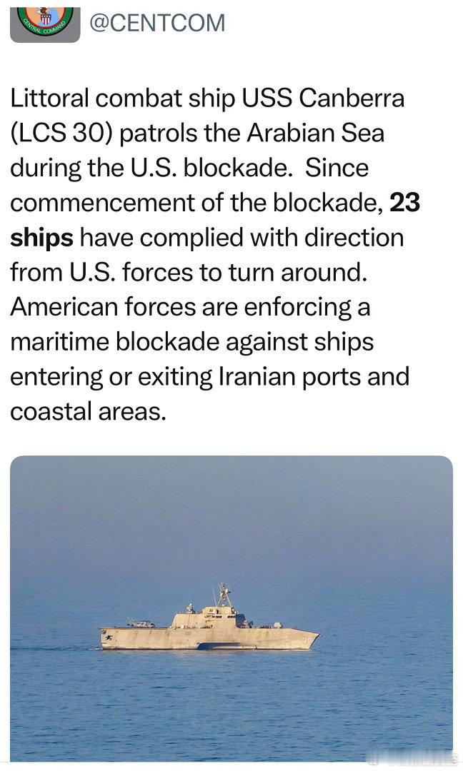美国对进出伊朗港口的船只实施封锁以来,已经要求二十三艘船折返美军正在做准备,很快
