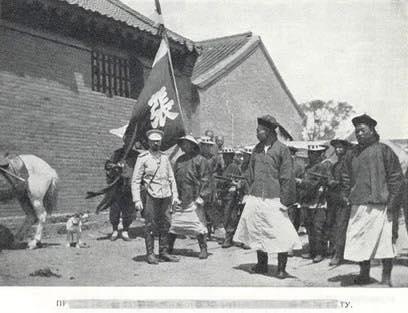 1900年,庚子国变时期,一杆迎风矗立的巨型帅旗,旗面硕大一个「張(张)」大字,是古代将帅专属的姓氏帅旗,代表这是一支张姓统领麾下的私人地方武装。