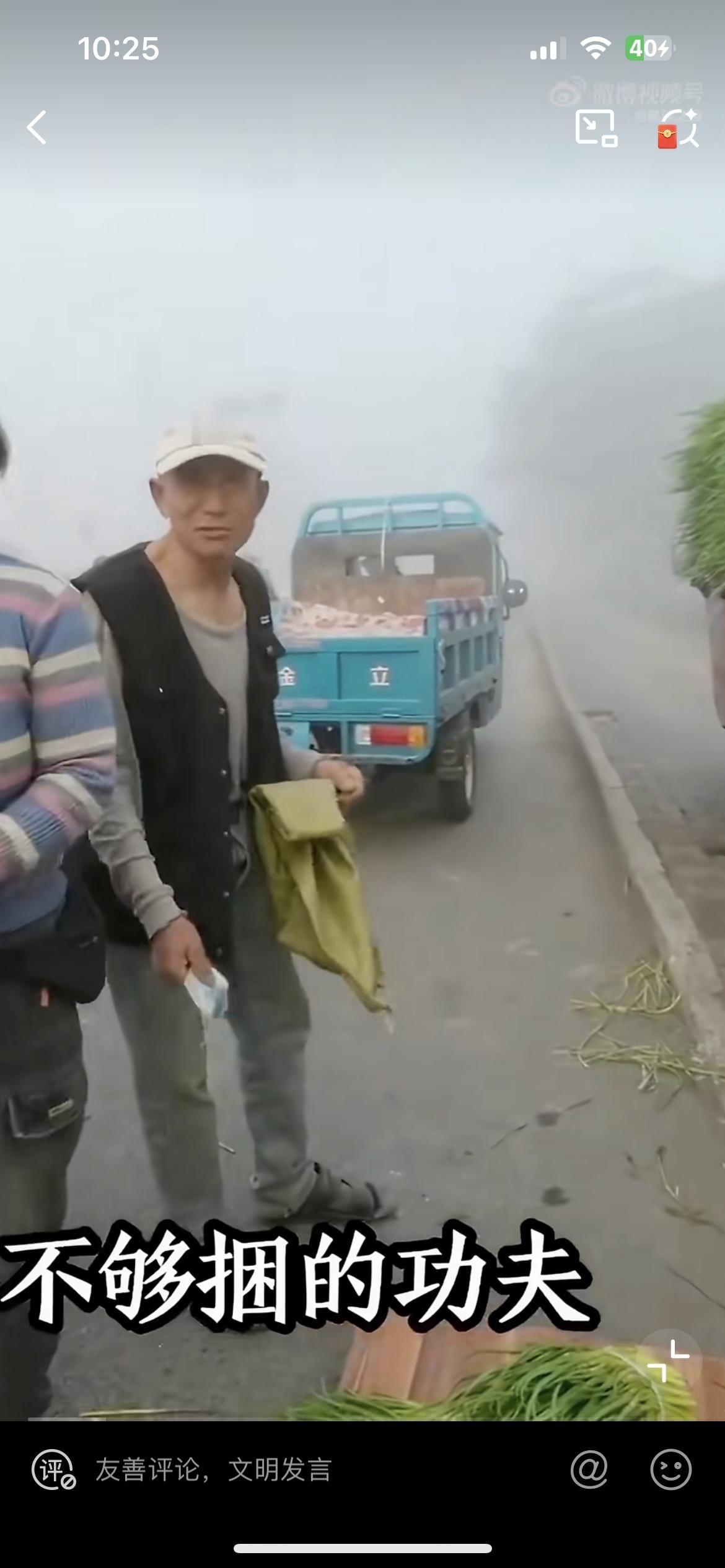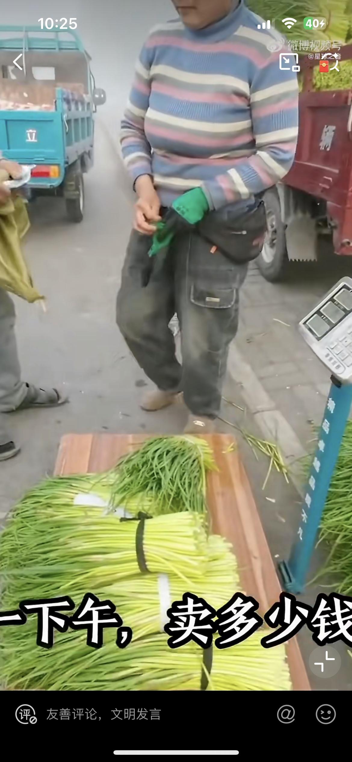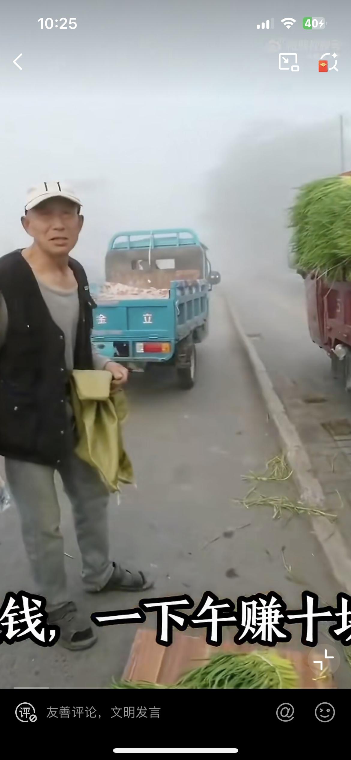 大爷一大捆自家种的蒜苔卖给菜贩才 10 块 5 毛钱,他说这是一下午的功夫,从菜地里收上来,捆扎好,再运到菜贩这里,就半天的时间挣了 10 块钱,感慨劳动力不值钱,辛辛苦苦种的蔬菜更是价贱,问题到底出在哪里?可明明菜市场这种新鲜的蒜苔4~6 块钱一斤,田间地头收购价不到一块钱。中间的环节钱到底被谁挣了?菜贩大姐却说她一天只挣六七十块钱,因为她上面还有更大的菜贩子。