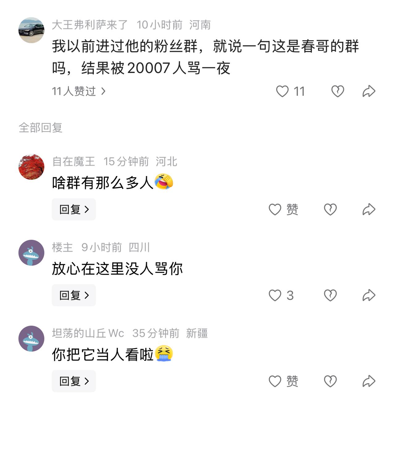 有一位网友误入他的粉丝群,不经意间问了这是春哥的群吗?被几万个粉丝轮番问候!