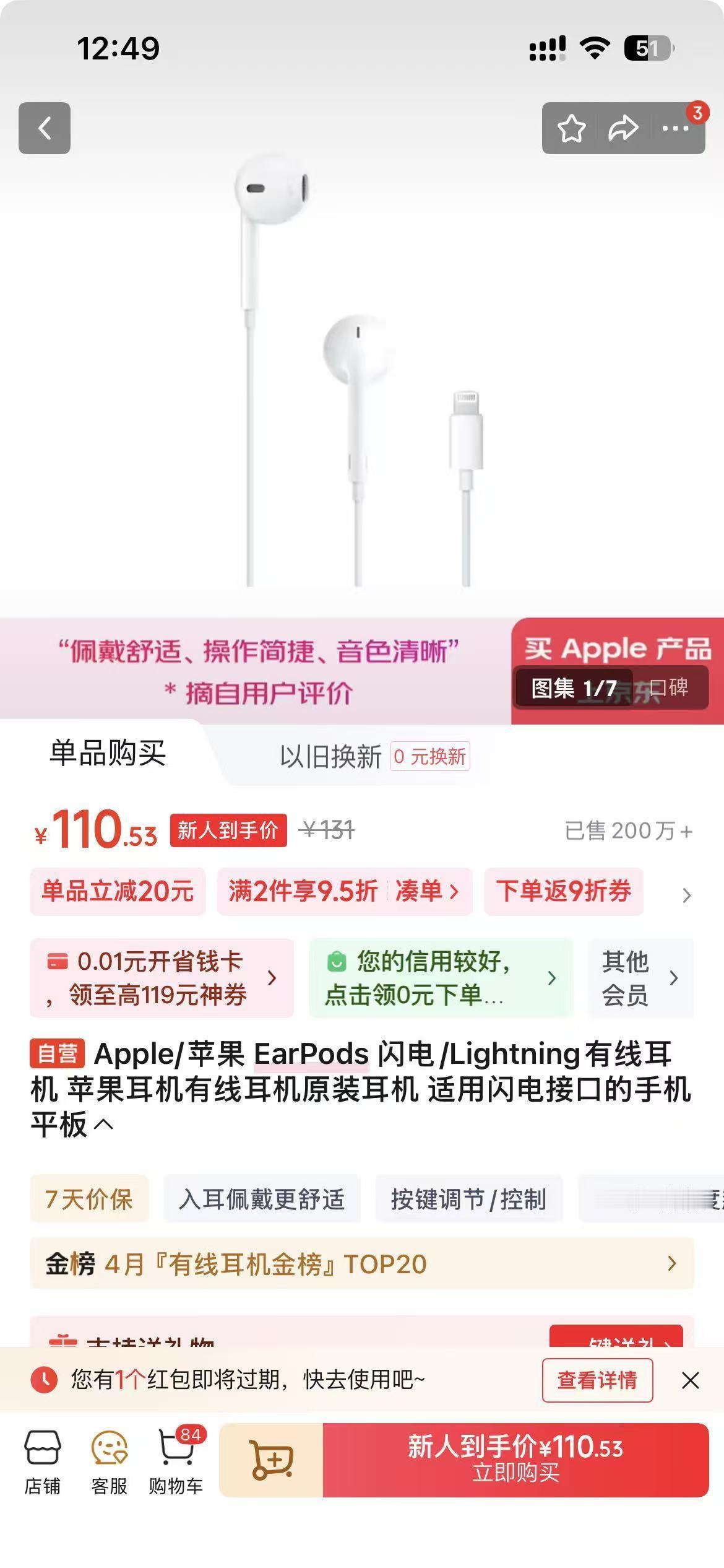 看看京东杀熟!同一款苹果有线耳机,京东plus会员显示的原价是149,到手价12