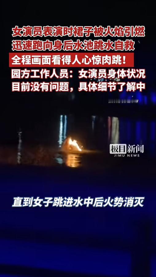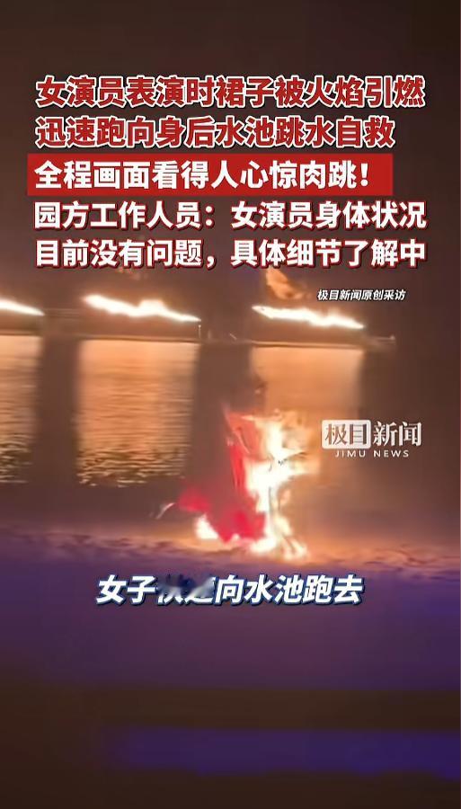 火苗顺着裙摆飞快往上爬,眨眼间就从裙边烧到了腰部以上,后背的火势也越来越大,女演员反应特别快,立马拽住烧起来的裙身,一边尖叫一边往表演场地后方的水池跑,全程也就11秒,她纵身一跃跳进水里,身上的明火才总算被扑灭。