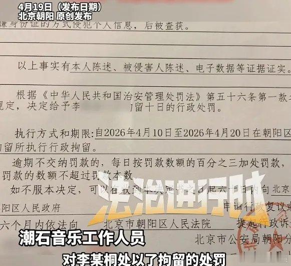 北京潮石音乐科技有限公司的工作人员在接受采访时表示,李某桐泄露艺人薛之谦身份证号码,导致艺人和其家人被“开盒”,包括其未成年的孩子的个人隐私在网络传播;李某桐泄露艺人手机号,导致艺人手机被骚扰短信和电话轰炸,微信被频繁骚扰添加,艺人因此不敢开机,严重威胁了艺人本人及家人的人身安全,公安机关经过调查认定李某桐违反法律规定,对李某桐处以行政拘留的处罚。