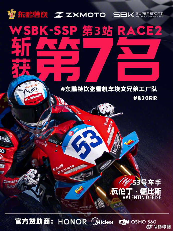 【#张雪机车荷兰站第二回合第7#】在刚刚结束的2026世界超级摩托车锦标赛(WSBK)荷兰站WorldSSP组别中,中国摩托车制造商的法国车手瓦伦丁·德比斯在第二回合正赛中排名第7。据介绍,比赛进行到还剩6圈时,赛道出现事故,红旗出动中断比赛,按照规则由于已经完成总里程的2/3,因此比赛提前结束,所有车手成绩按照最后一个计时点结束时的排名。#张雪机车##张雪机车第7#