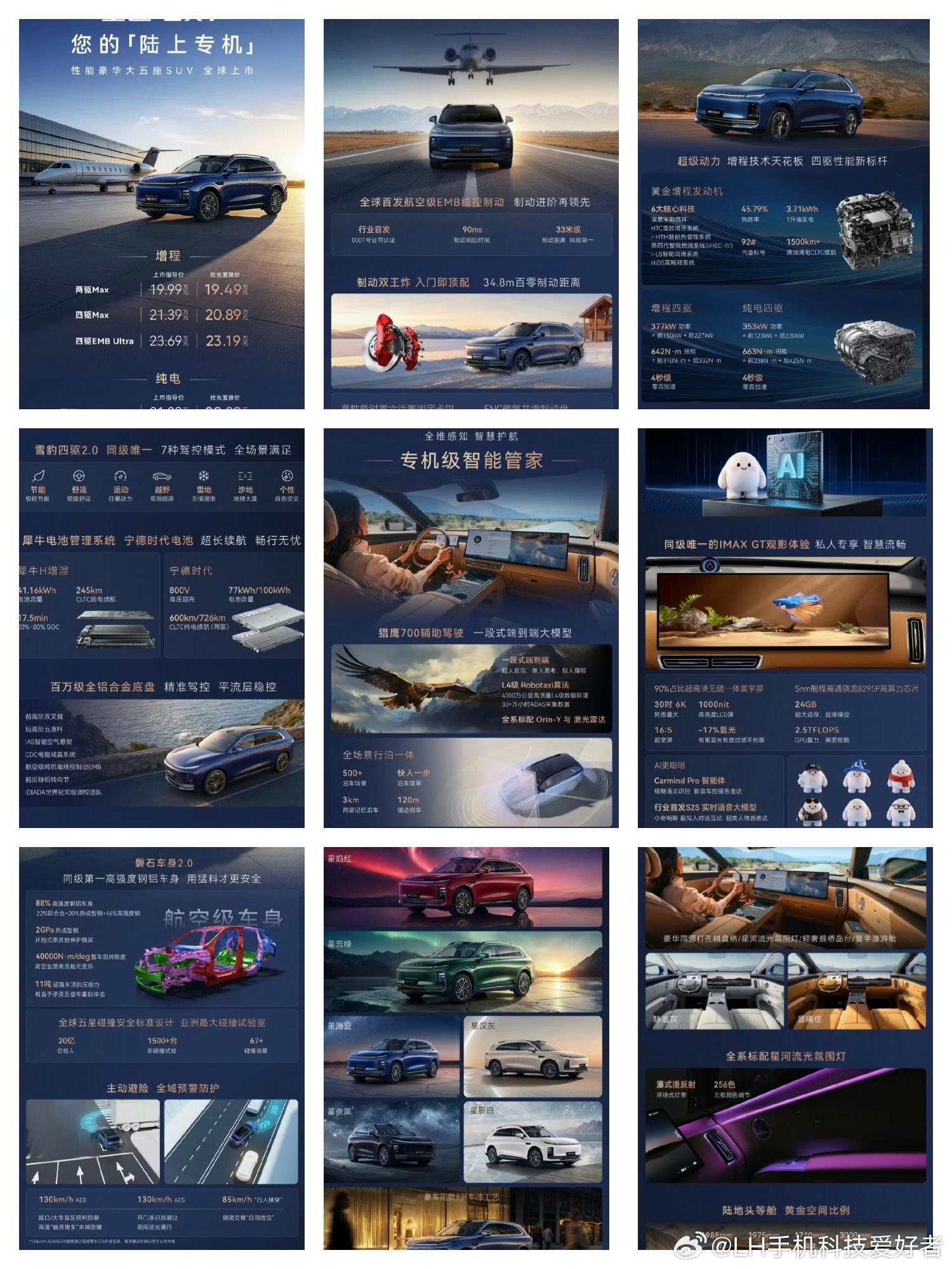 增程两驱Max售价19.99万元;增程四驱Max售价21.39万元;增程四驱EMB UItra售价23.69万元。