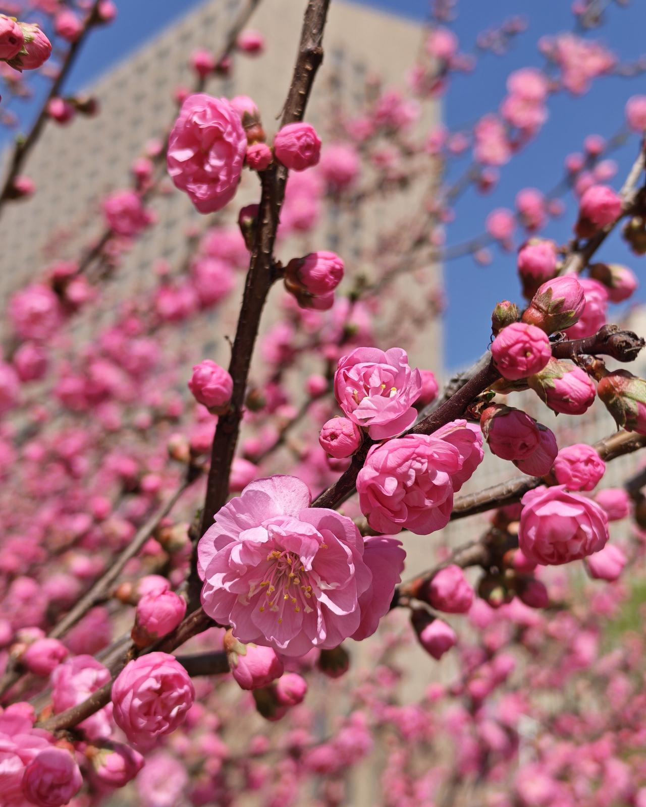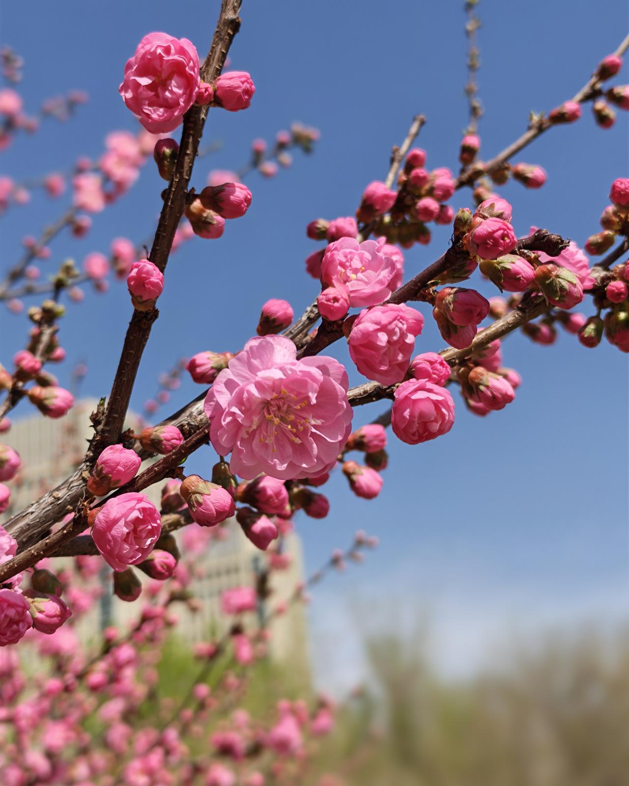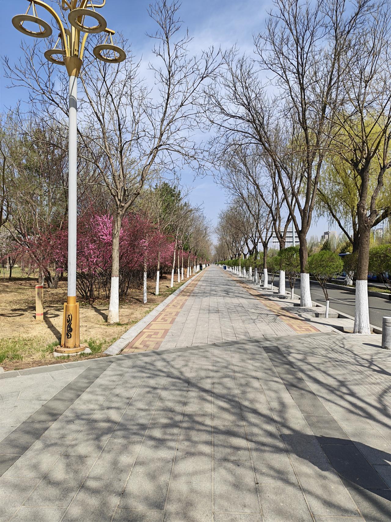 四月份的春天,树木抽出新的枝条,桃花盛开,道路两旁红花柳绿十分美丽。