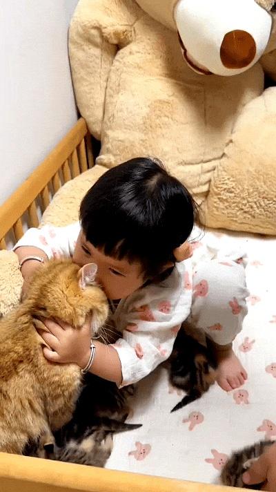 完了还不放过猫妈,扑上去抱住大橘的脑袋一顿蹭,对着脸也猛亲几下。