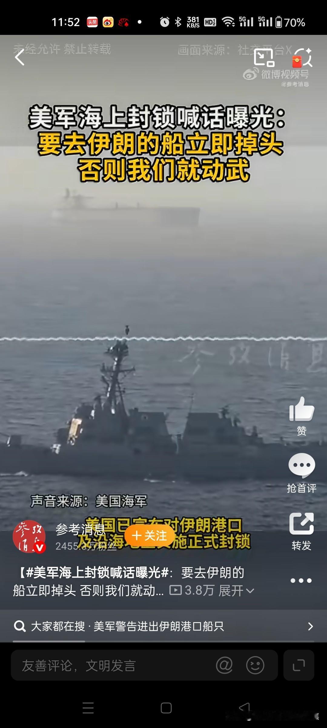 美军中央司令部发布声明,美军向一艘驶向伊朗阿巴斯港的伊朗货船“TOUSKA”号开了火,美军在军事强国面前实在太过招摇。