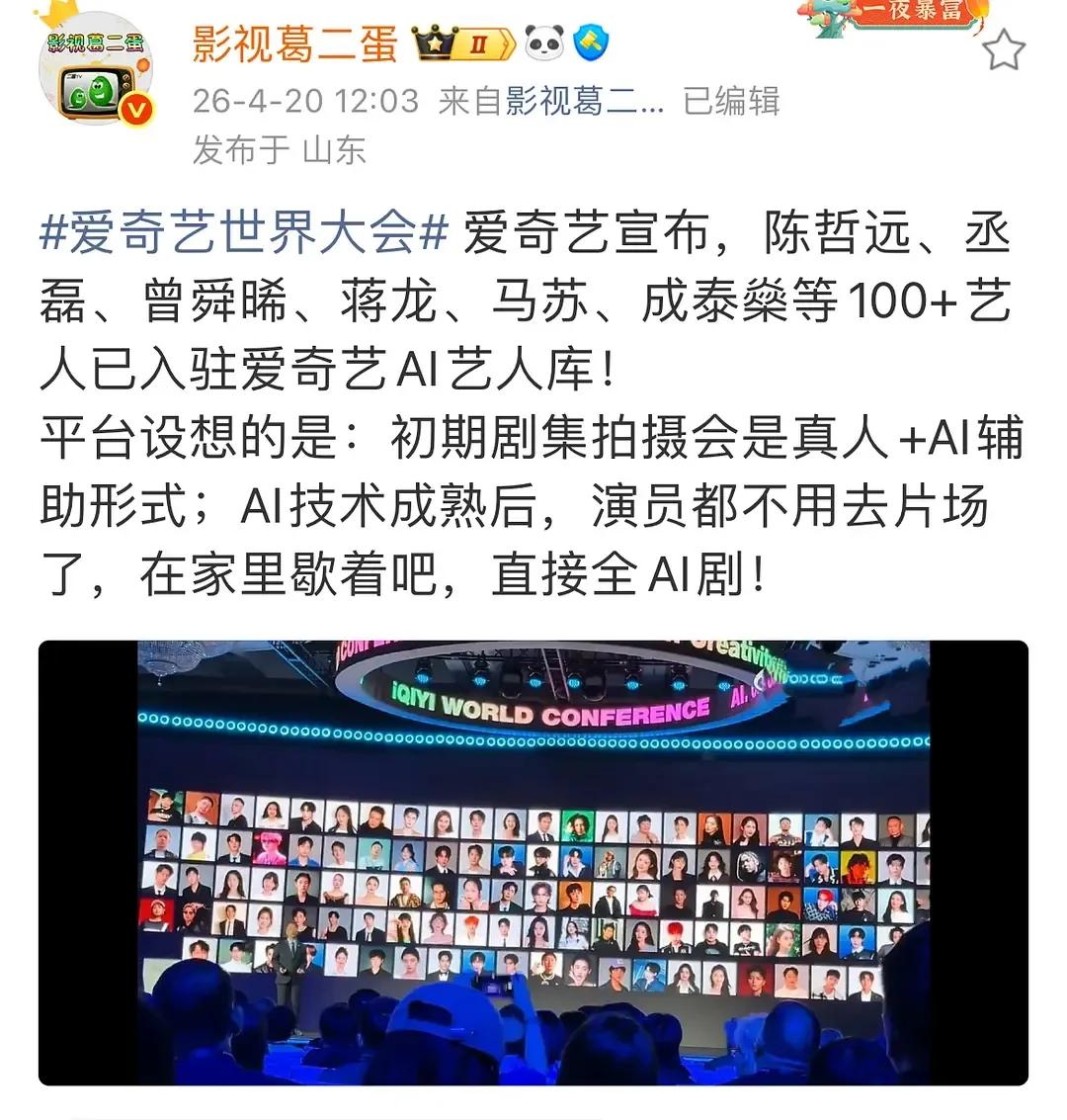 爱奇艺总监说演员将来会是非遗,在未来,演员会有更多的时间过自己的生活,本来一年只能拍四部剧,但是有了AI之后,他们一年能演14部剧。