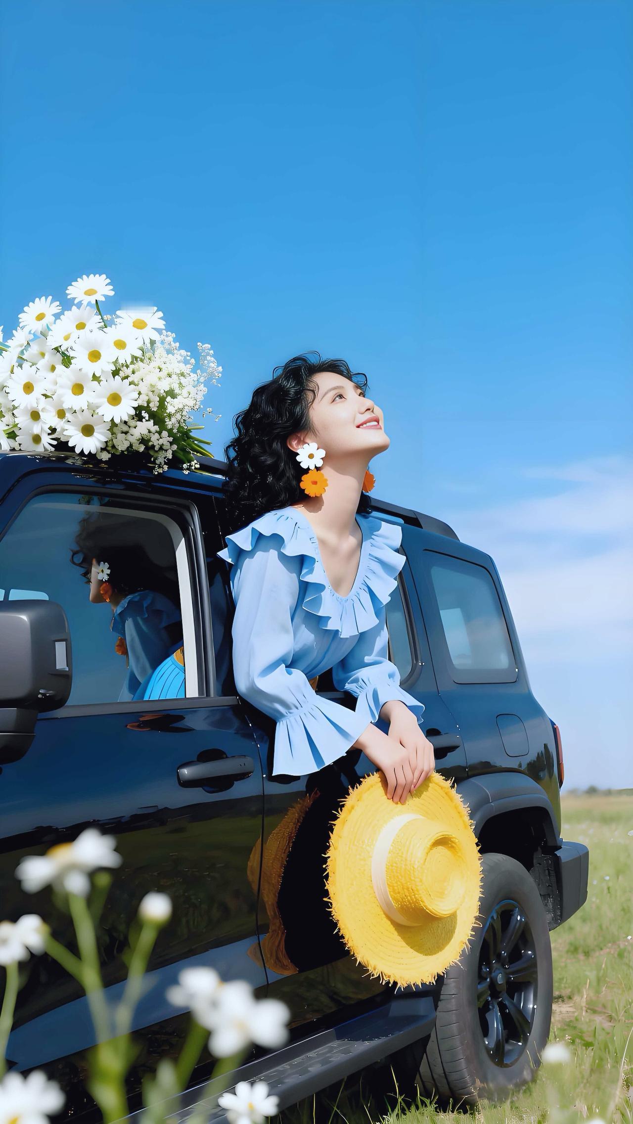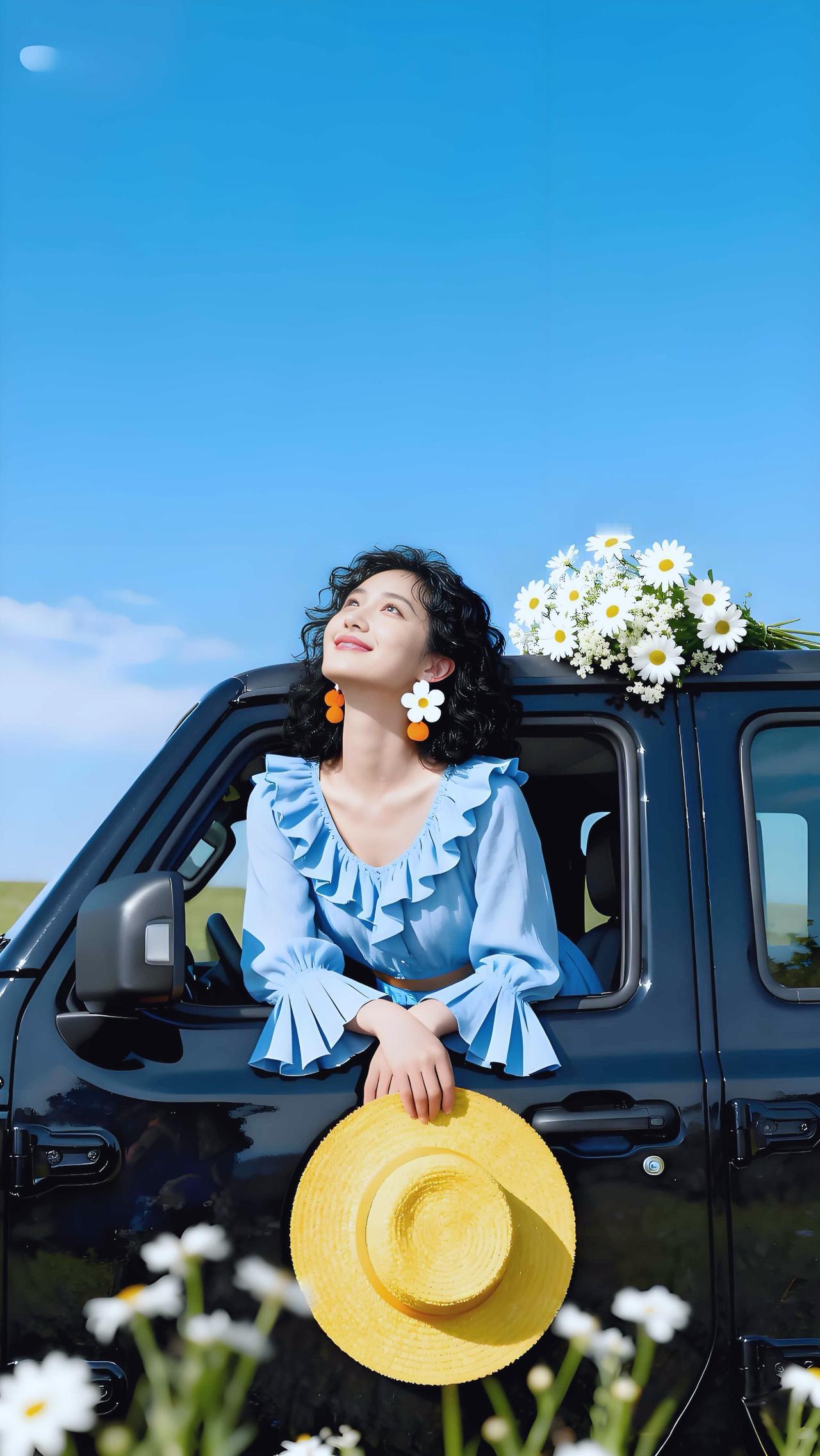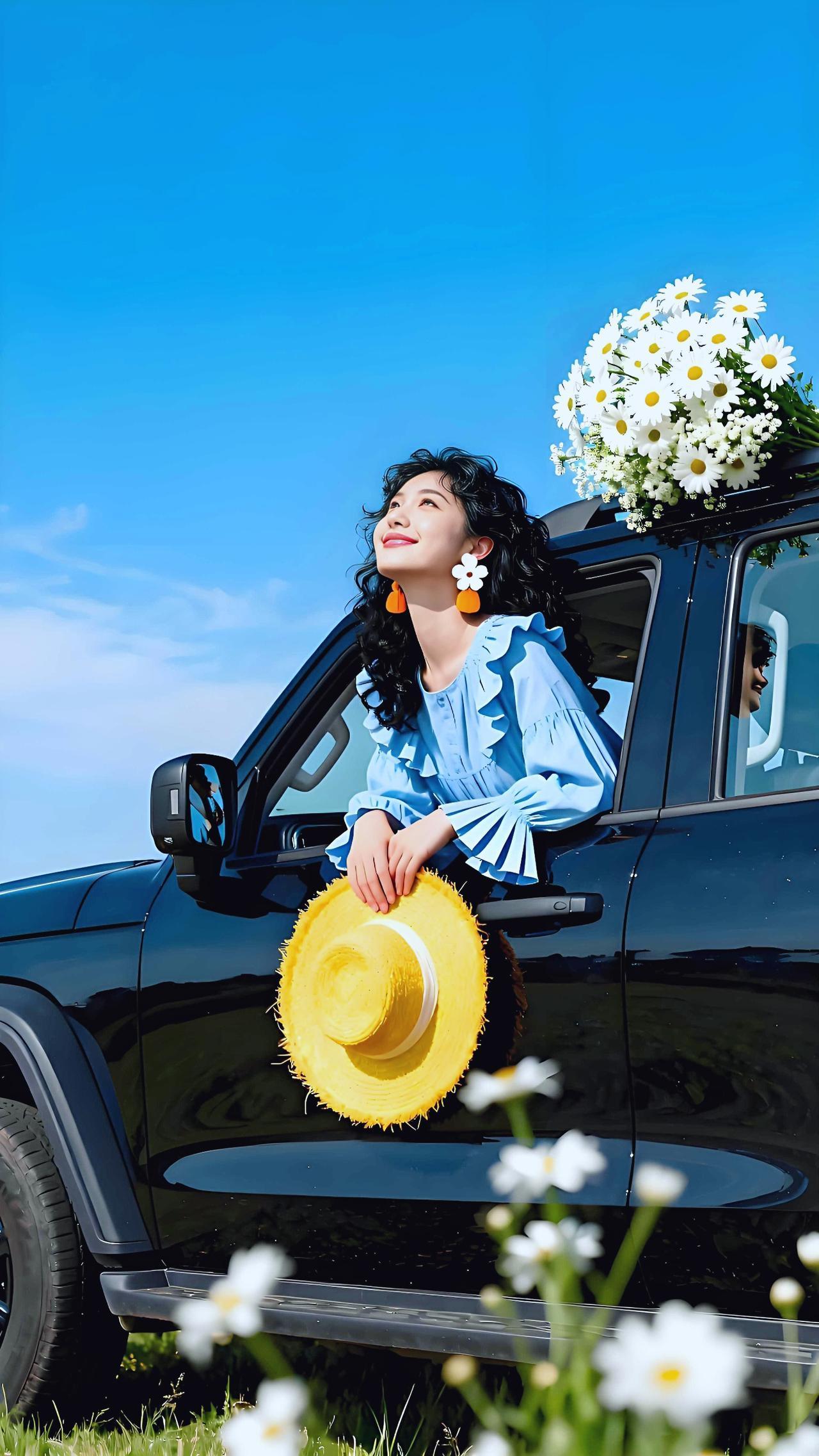 晴光漫洒郊野,蓝裙少女探出车外,指尖勾着明黄草帽,雏菊绕身,笑眼望云。