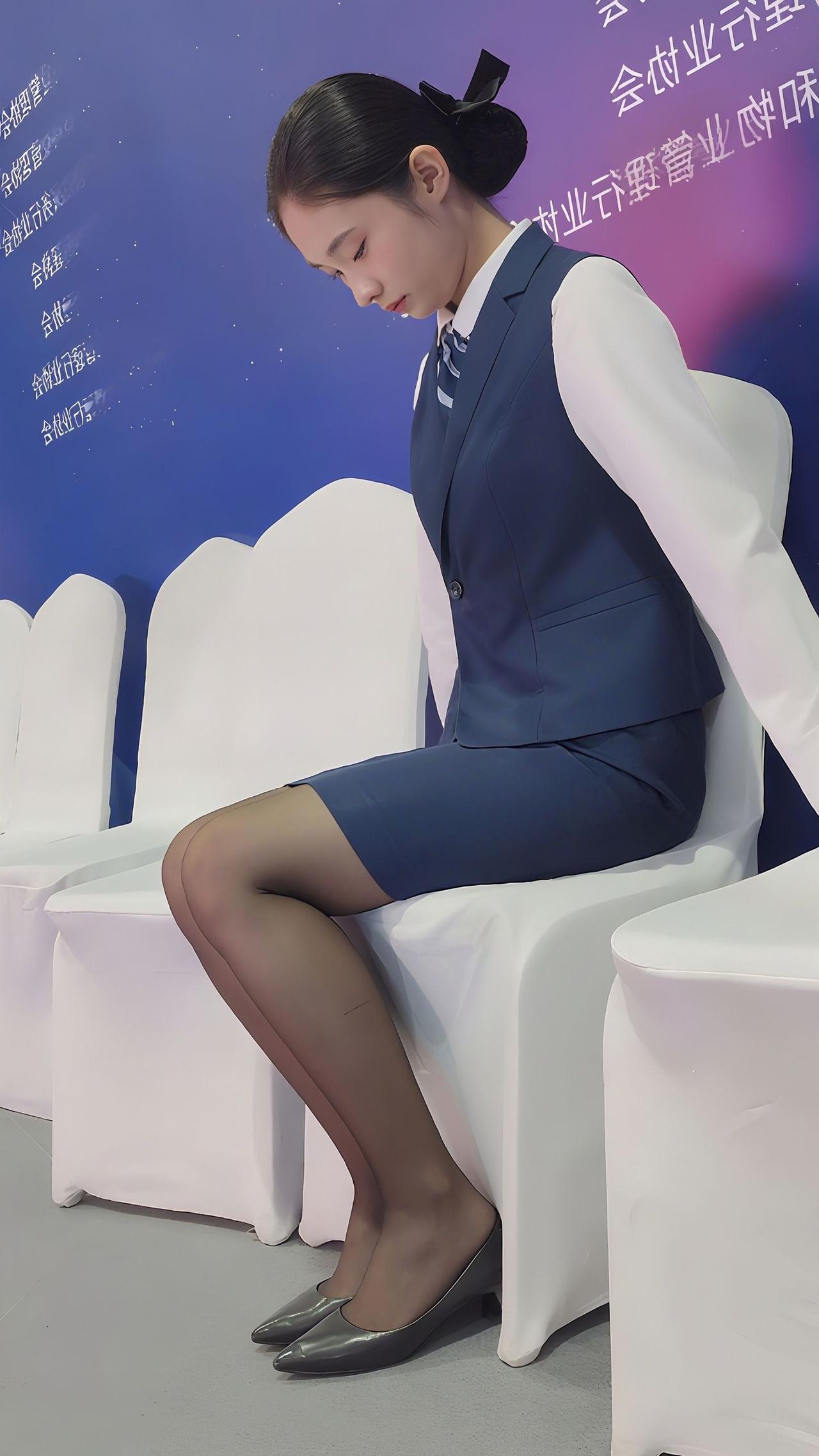 优雅职场风,蓝白条纹衬衫搭配深蓝色背心裙,黑色丝袜和尖头高跟鞋,尽显女性魅力。