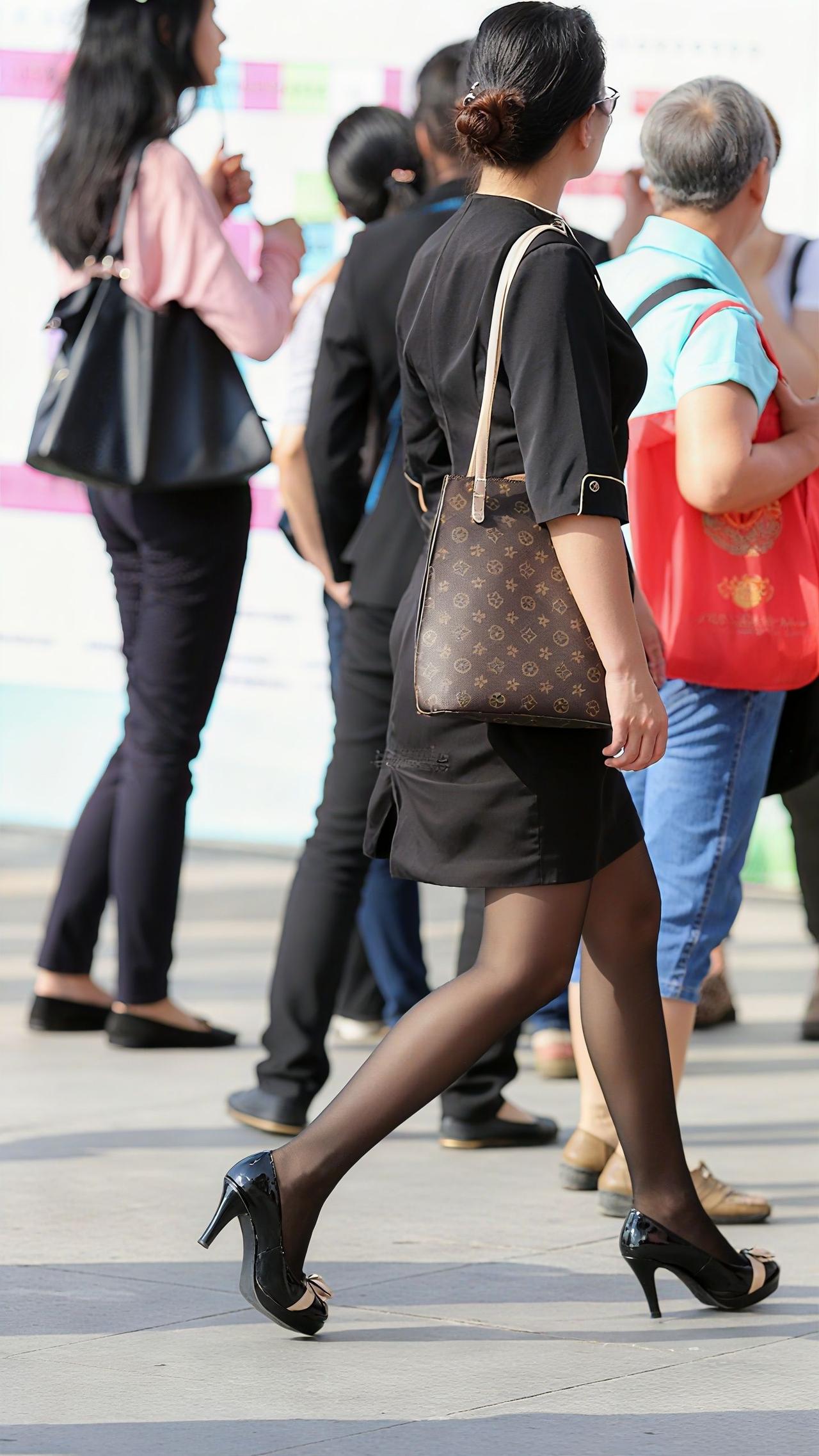 优雅的黑裙搭配高跟鞋,手提包点缀,都市女性的时尚日常。