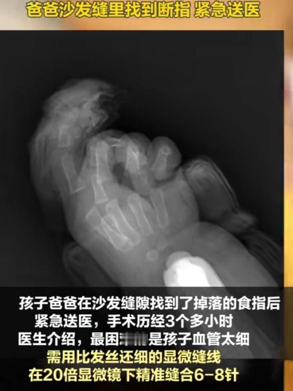 可是孩子被妈妈剪断的断指竟不知去向,还好,孩子爸爸在沙发缝隙中找到了掉落的手指。